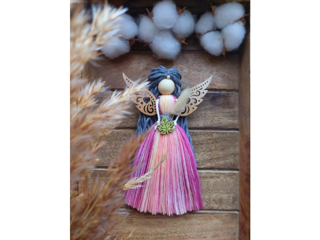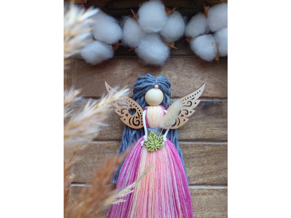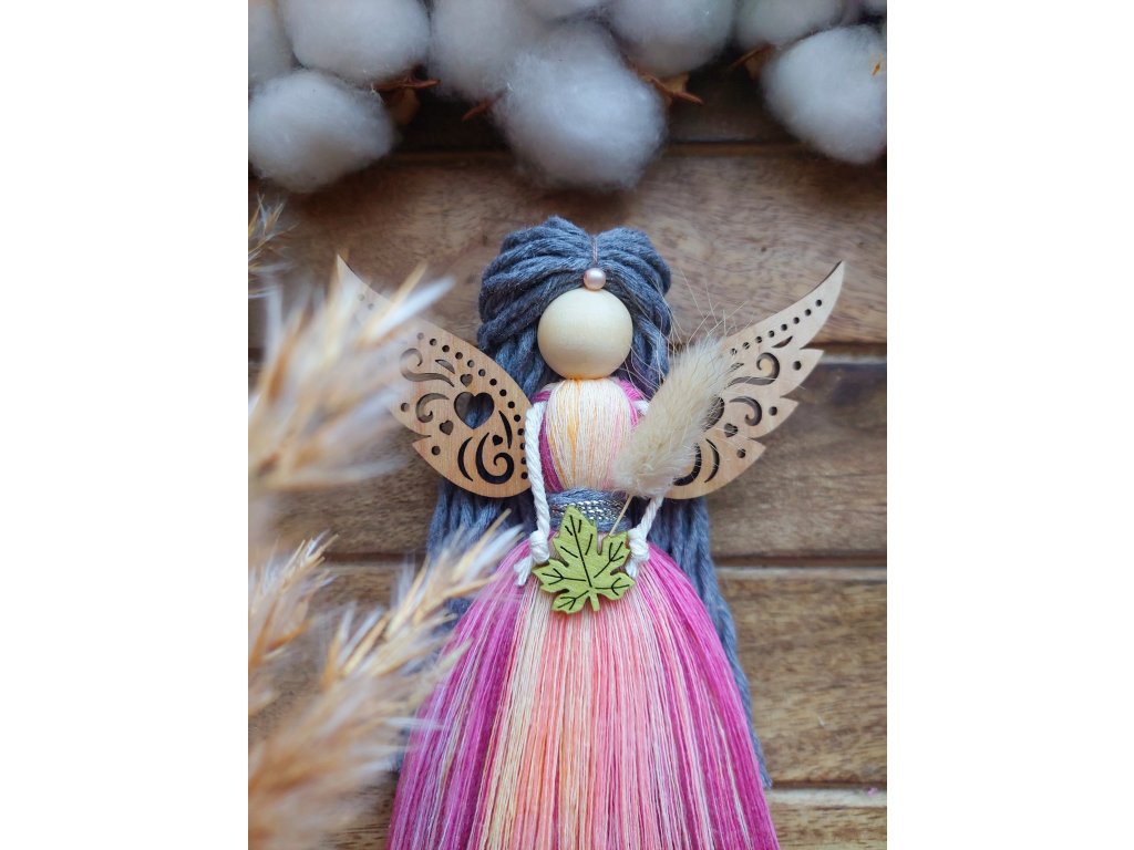 Každá Andělka měří 15 cm a je tvořena ručně z přírodních materiálů -100% bavlněné šňůry, dřevěný korálek, dřevěná křídla, sušené traviny, jemné dřevěné doplňky a voskovaný korálek, který podtrhuje její jemnou, podzimní atmosféru.
