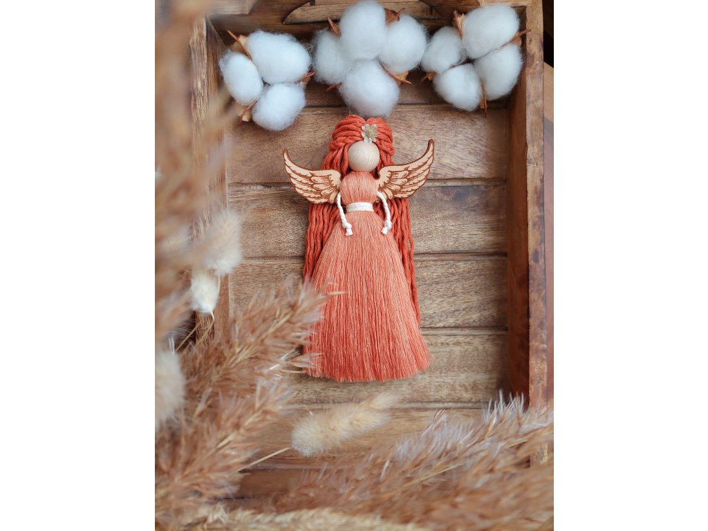 Každá Andělka je ručně vytvořený originál o velikosti 15 cm. Má dřevěná křídla, dřevěný korálek jako hlavičku a její šaty i vlásky jsou z bavlněných a bambusových šňůr. Ve vlasech má něžnou sušenou květinku.