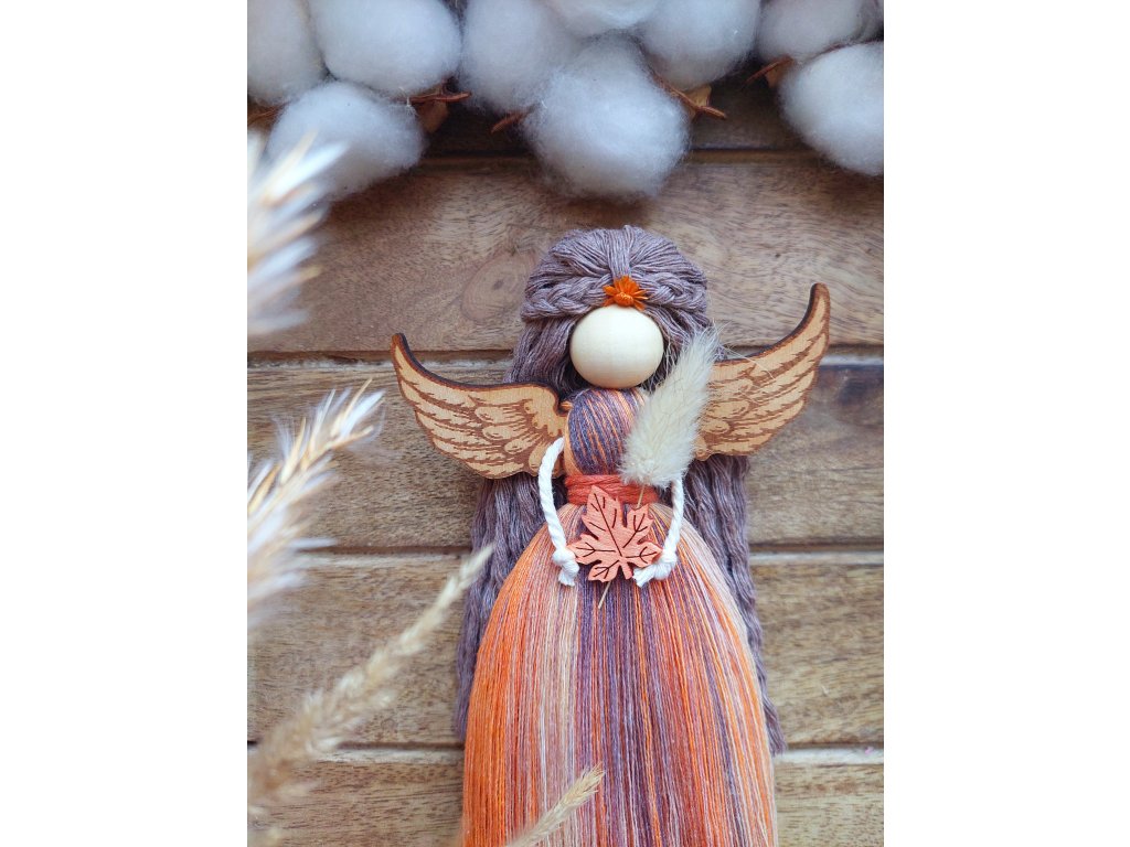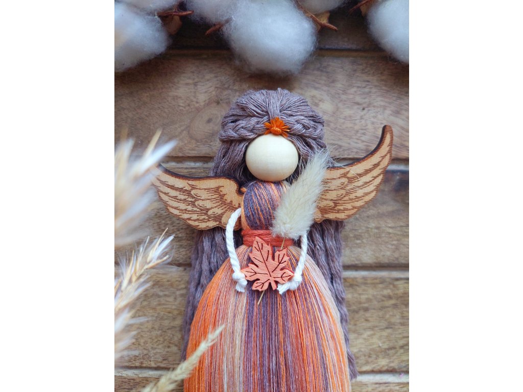 Každá Andělka měří 15 cm a je tvořena z přírodních materiálů - 100% bavlněné šňůry, dřevěná křídla, dřevěný korálek, doplněné o sušené traviny a květiny.