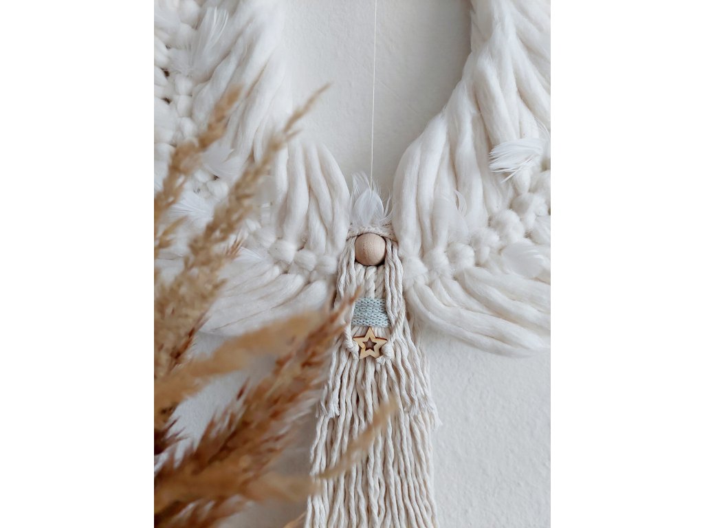 Křídla jsou vyrobena z měkké, huňaté candy příze, doplněná o jemná peříčka, která symbolizují lehkost a očištění. Andělka má peříčkovou čelenku, bílý základ šatů a charakteristický barevný pás. V rukách drží symbolický prvek (může to být např. peříčko, kamínek či jiný ochranný detail).