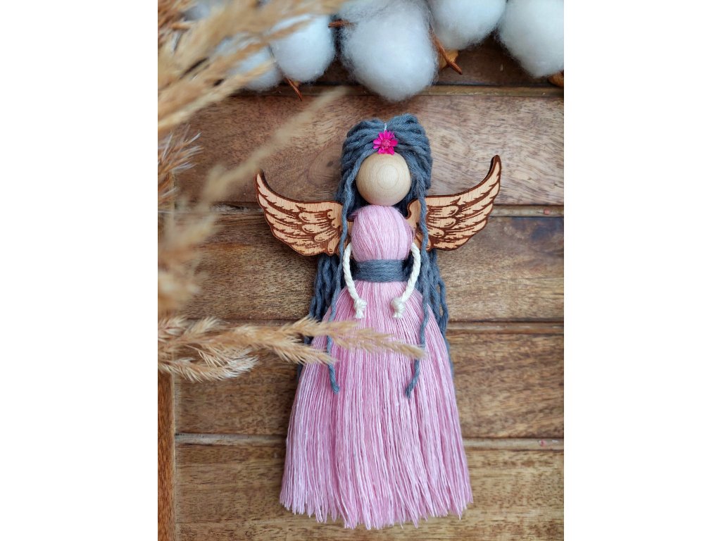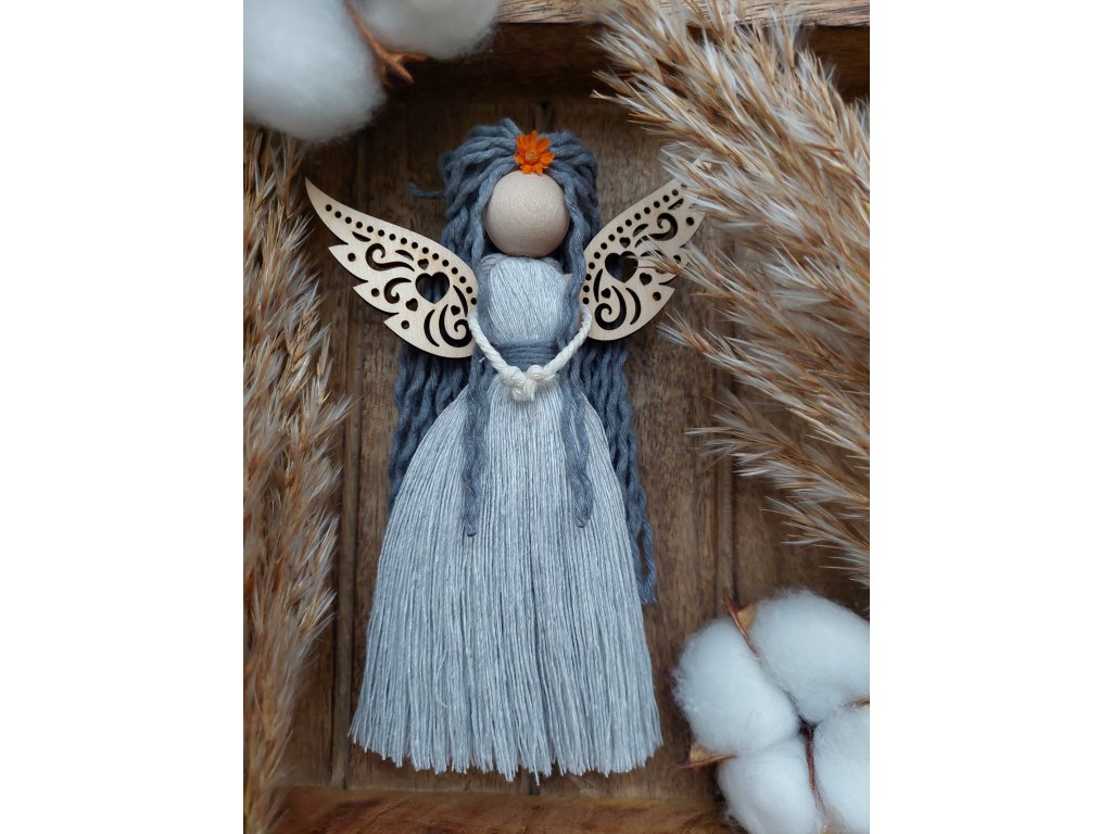 Každá Andělka je ručně tvořený originál o výšce 15 cm, vytvořený z přírodních materiálů -100% bavlněné šňůry, dřevěný korálek, dřevěná křídla a sušené květinky ve vlasech. Dostupná je ve dvou variantách.
