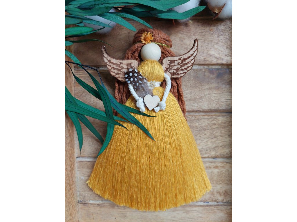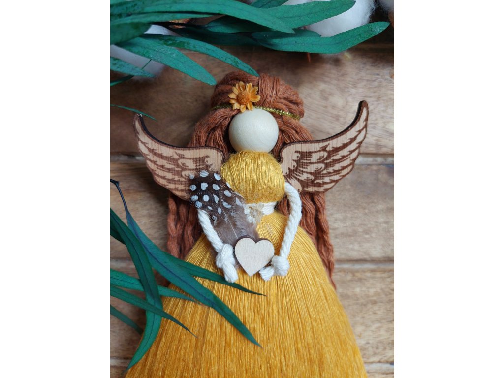 Andělka ZLATUŠKA je ručně tvořená dekorativní bytost ve zlatých a žlutých bambusových šatech, které se pyšní bohatou, jemnou a lesklou strukturou. Žlutá barva podporuje pozitivní naladění, radost a optimismus, zatímco zlaté tóny jí dodávají elegantní a hřejivý nádech. V rukou drží peříčko jako symbol lehkosti a srdíčko jako připomínku lásky a jemnosti.