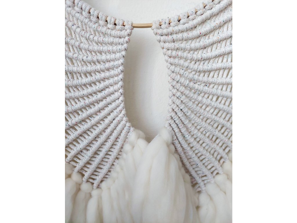 Základ je vytvořen macramé technikou, doplněnou jemnými merino česanci a stabilizovaným nedobarvovaným lišejníkem. Ten je použit záměrně – lišejník je organismem, který dokáže přežít i v extrémních podmínkách a připravuje prostor pro další život. Jeho přítomnost ve tvorbě symbolizuje vytrvalost, stabilitu a tiché ochranitelské působení.