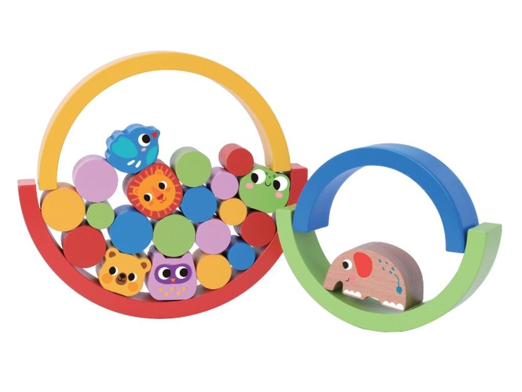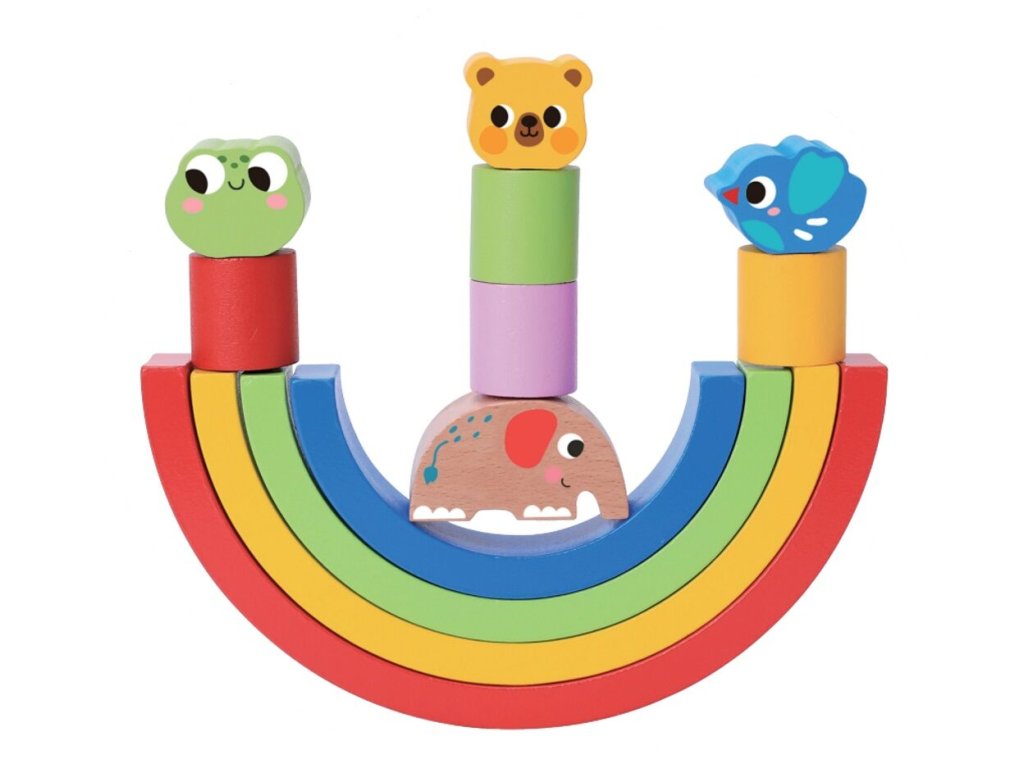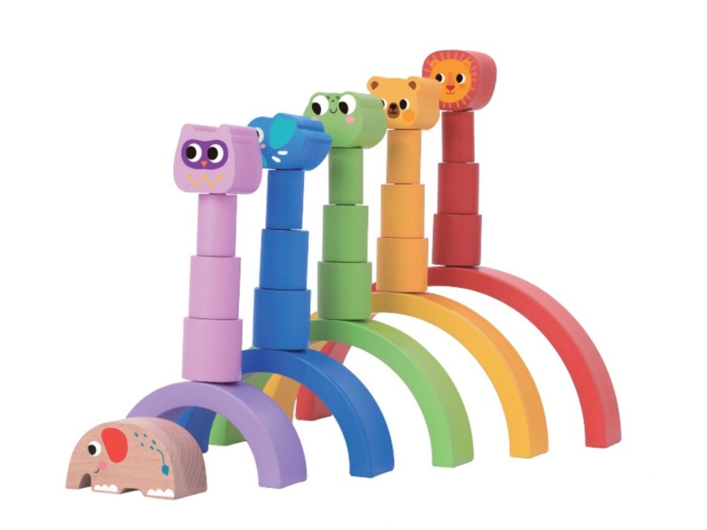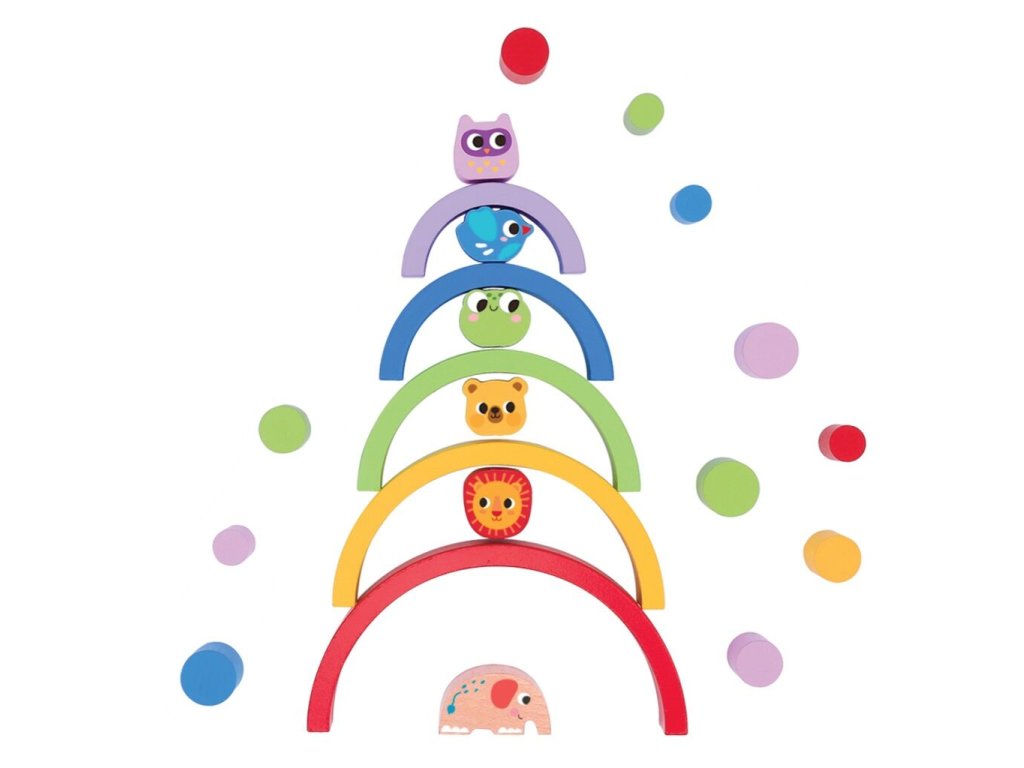 Tato dřevěná duha se zvířátky nabízí dětem prostor pro volnou, tvořivou hru. Stohovatelné oblouky různých velikostí a barev lze skládat na sebe, rozkládat, kombinovat a vyvažovat. Děti mohou stavět věže, vytvářet dráhy pro kuličky, houpačky pro plyšáky nebo se pustit do soutěže, kdo postaví nejvyšší a nejstabilnější konstrukci. Hračka přirozeně podporuje rozvoj obratnosti, představivosti i smyslu pro rovnováhu a zároveň se stává krásnou dekorací dětského pokojíčku.