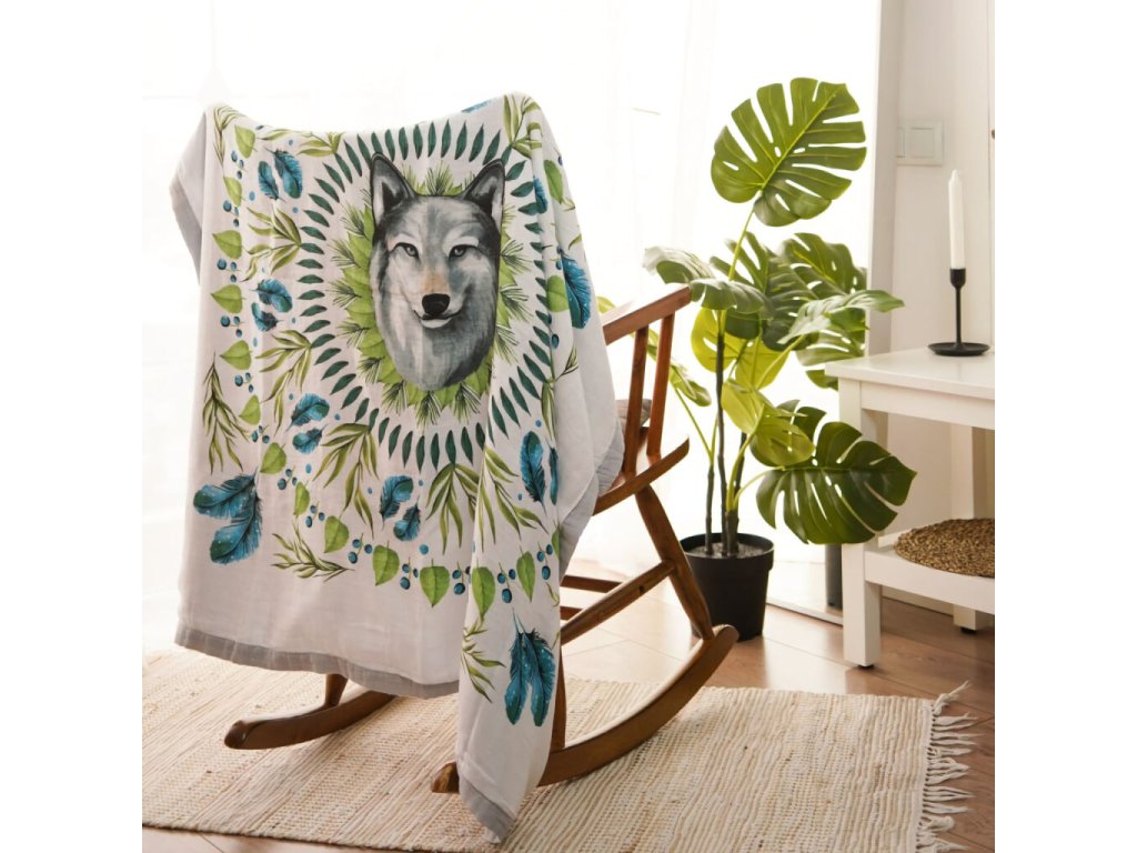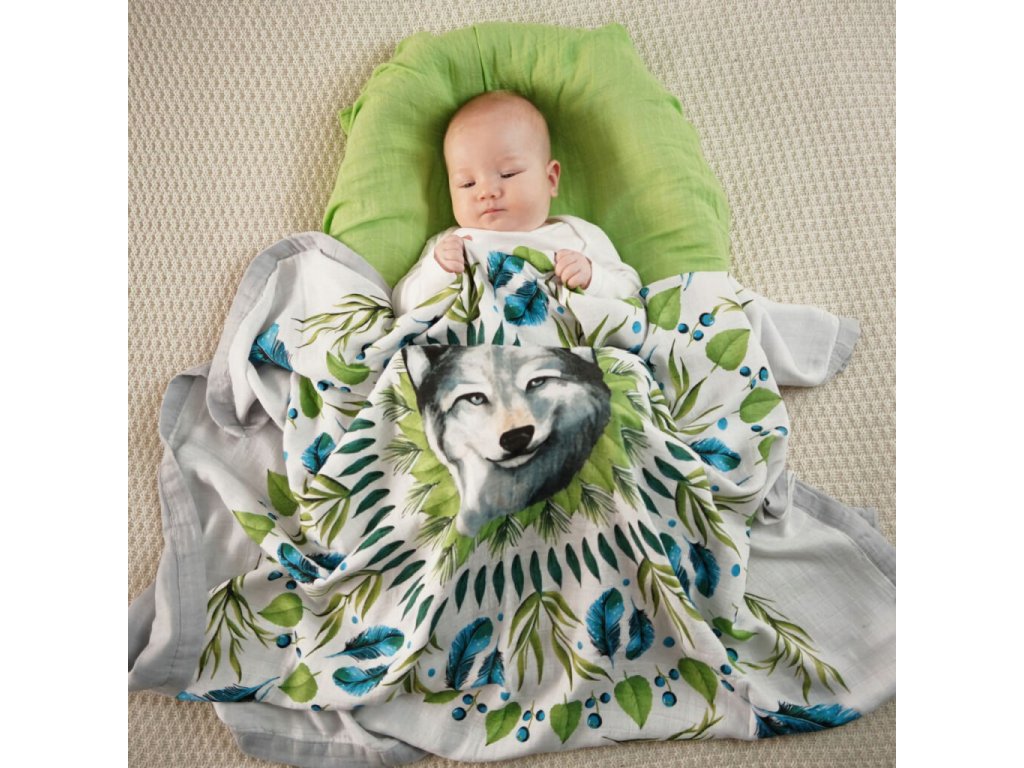 Mušelínová přikrývka s motivem vlka je vyrobena ze 70 % bambusu a 30 % bavlny, což zajišťuje výjimečnou hebkost, prodyšnost a příjemný pocit při každém dotyku. Bambus dodává materiálu jemnost a šetrnost k citlivé pokožce, zatímco bavlna zajišťuje chladivý efekt a optimální cirkulaci vzduchu. Přikrývka je tvořena čtyřmi prodyšnými vrstvami, které poskytují maximální pohodlí během spánku i odpočinku. Originální design inspirovaný přírodou a pečlivé zpracování dělají z této dečky jedinečný doplněk pro každé miminko.