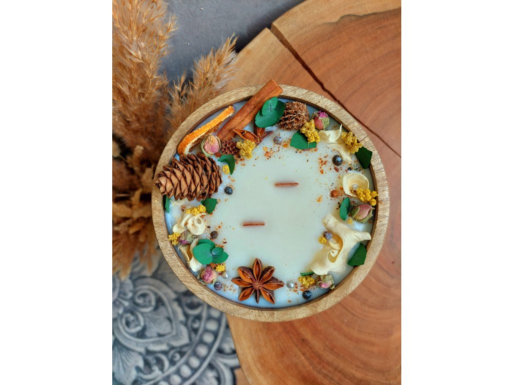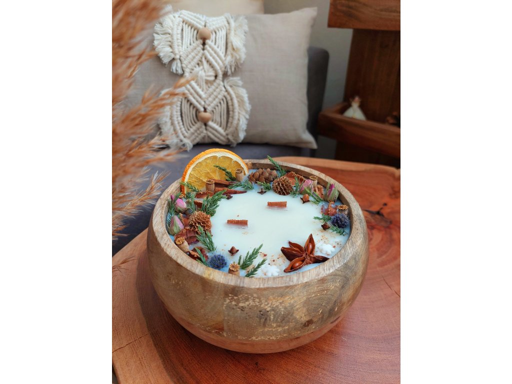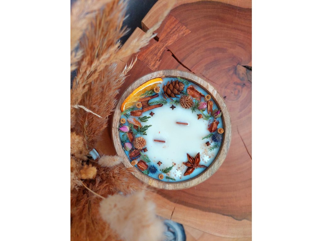 Přírodní svíčka ČAROVÁNÍ ZIMY je ručně tvořená přírodní svíčka v nádherné misce z mangového dřeva, která dodá interiéru útulnost zimního lesa.