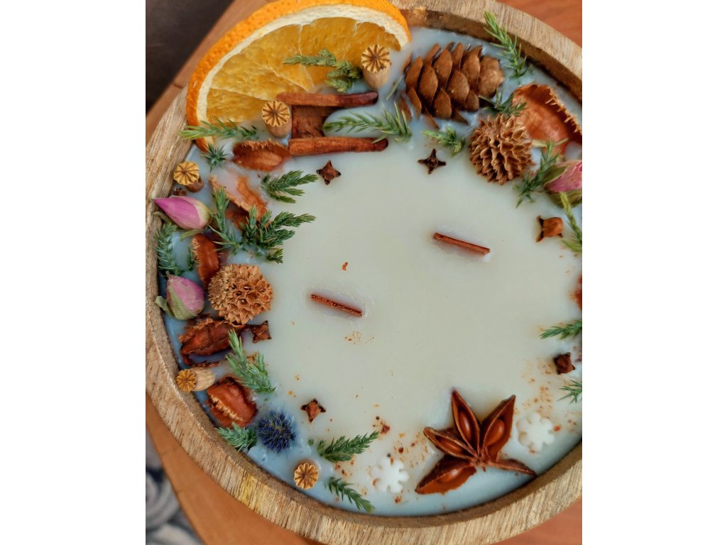 svíčka je zdobená přírodninami jako jsou šišky, jehličnany, citrusové plátky, koření a drobné detaily, které společně vytvářejí atmosféru zimní přírody. Každý kus je originál a zdobení se může lišit podle dostupných materiálů.