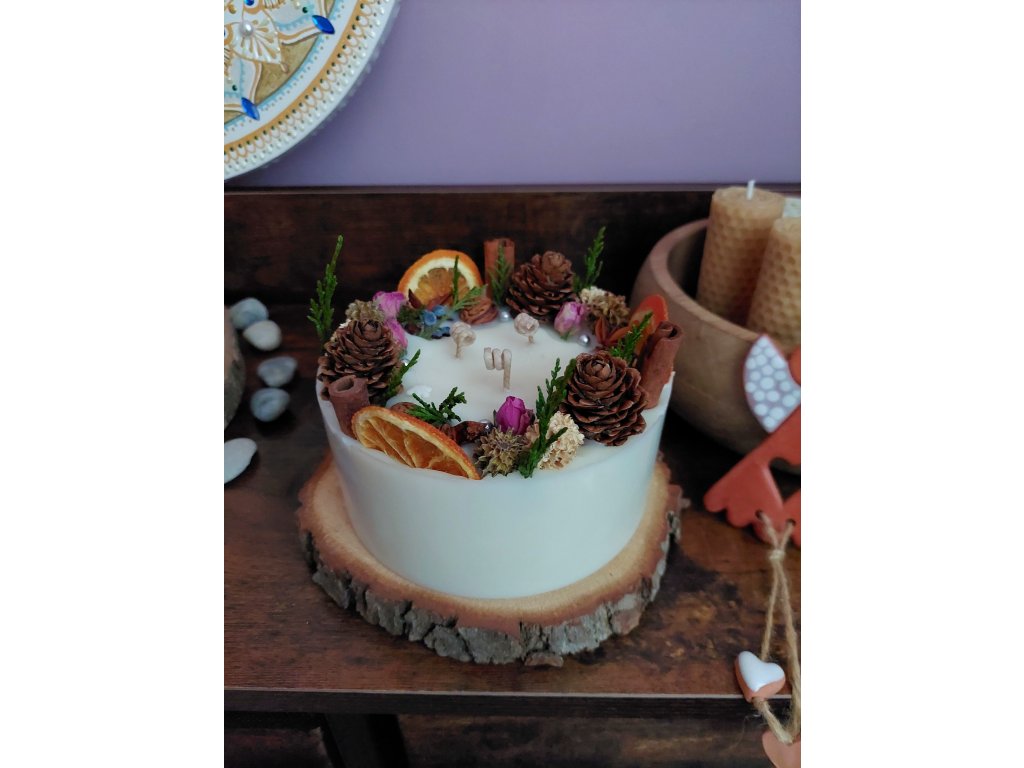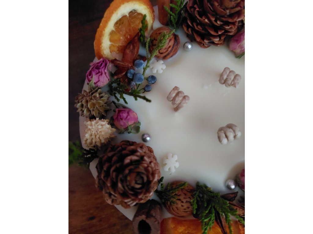 Svíčka je dekorována po celém obvodu bohatou směsí přírodnin: sušené květiny, větvičky jehličnanů, mini šišky, plátky citrusů, kousky koření a další sezónní detaily.