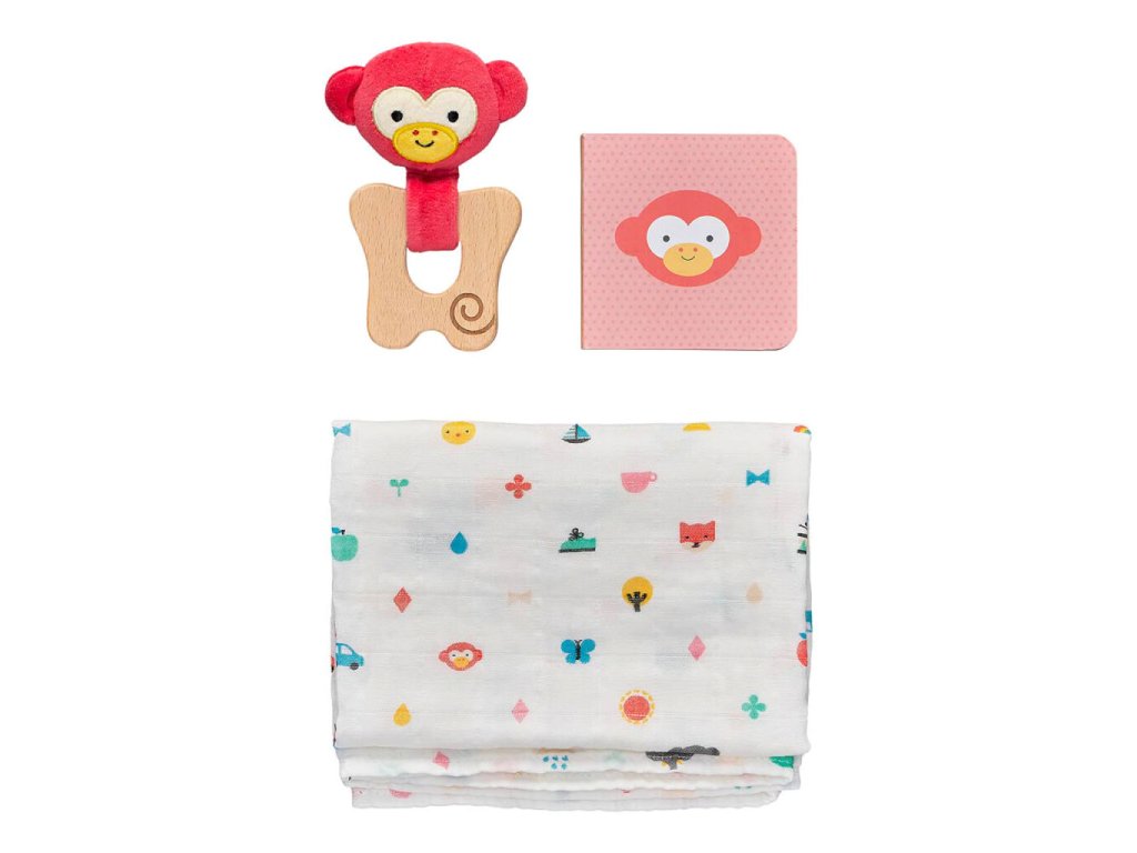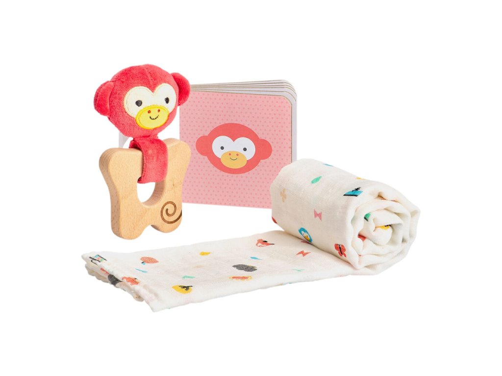 Opičí dárkový set je navržen jako ideální startovní balíček pro miminko v prvních měsících života. Obsahuje tři pečlivě vybrané produkty, které noví rodiče skutečně využijí – při odříhávání, růstu prvních zoubků i při prvním objevování světa.