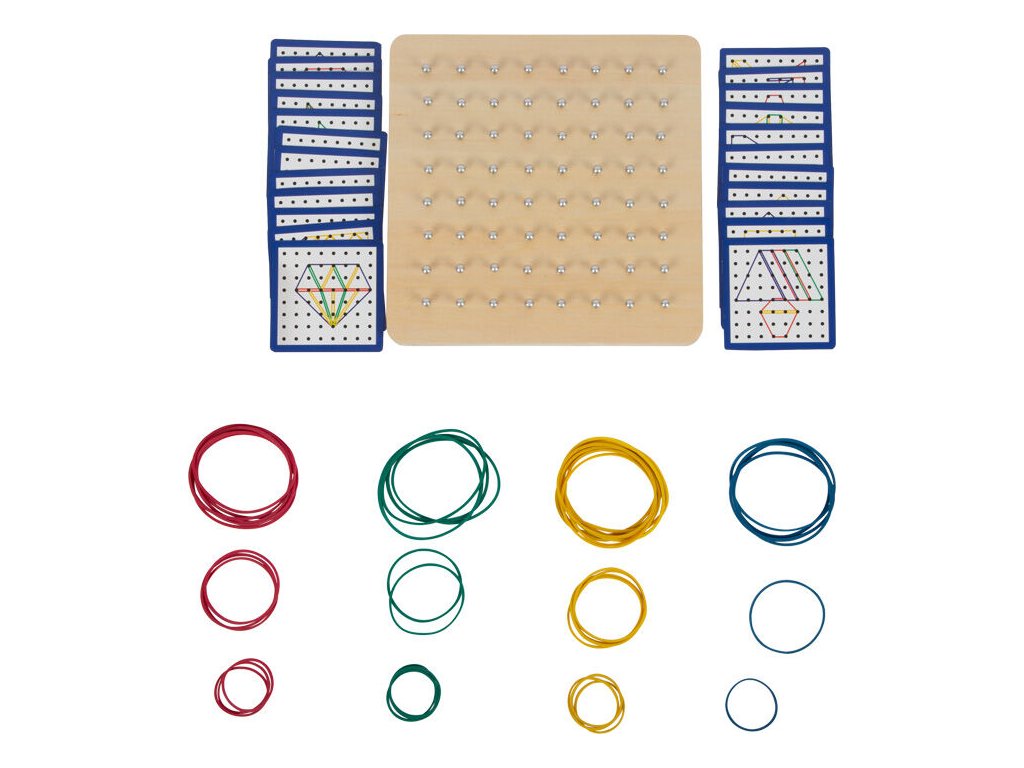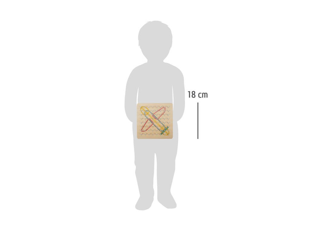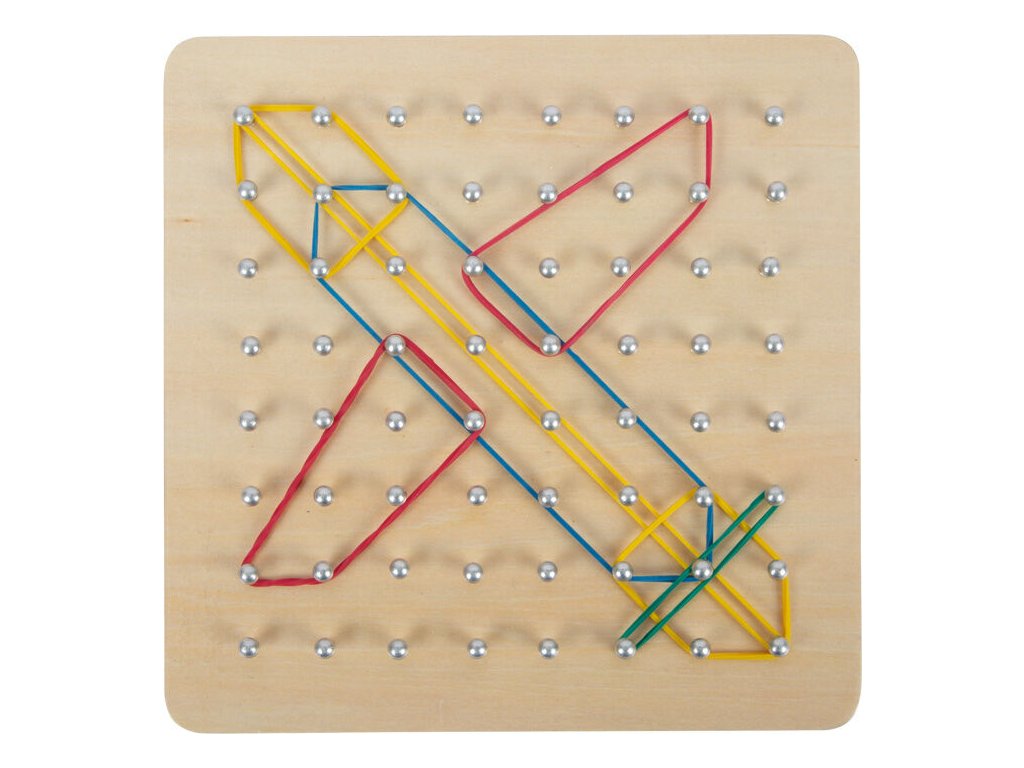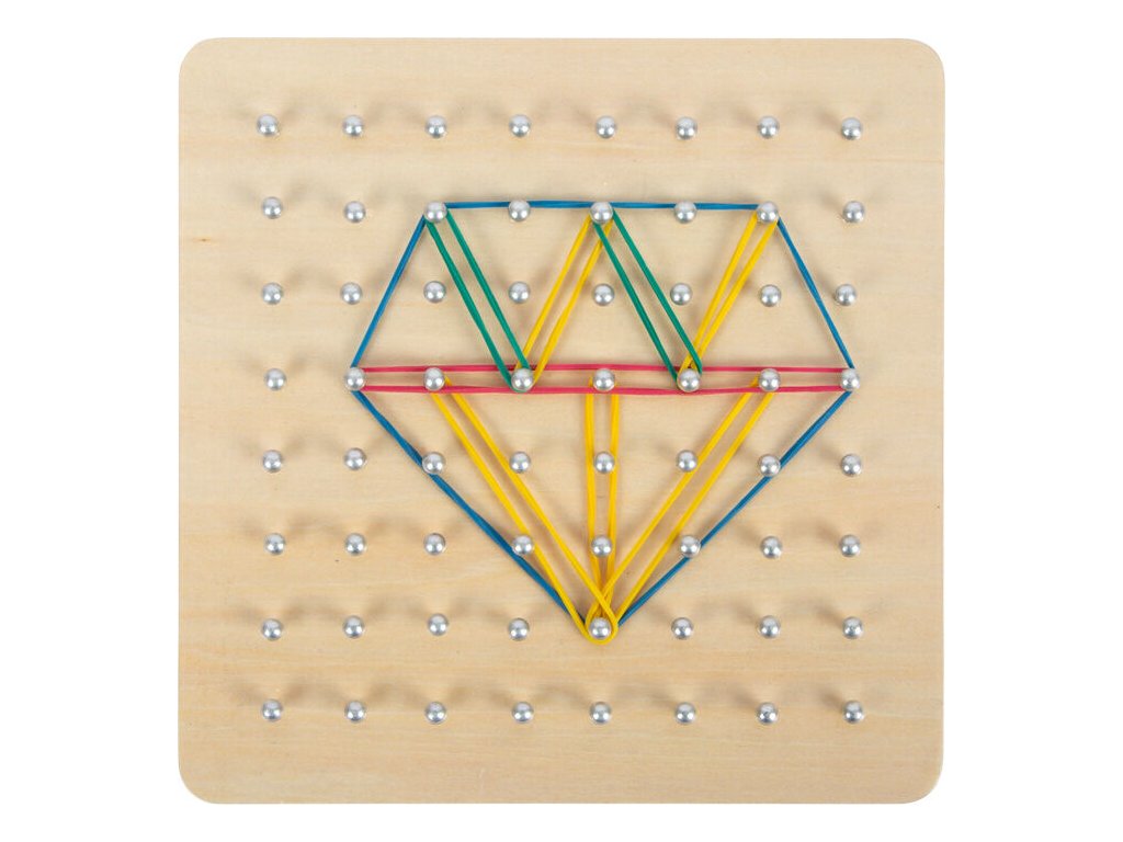 Dřevěná deska Geoboard nabízí nekonečný prostor pro dětskou fantazii a tvořivost. Na stabilní dřevěné základně se nachází 64 zaoblených hřebíčků, na které děti natahují barevné gumičky a vytvářejí geometrické i zcela vlastní tvary. Součástí balení je 23 obrázkových kartiček s předlohami, podle kterých si děti mohou procvičovat logické myšlení i přesnost. Hra podporuje přirozené učení hrou a rozvíjí důležité dovednosti již od raného věku.