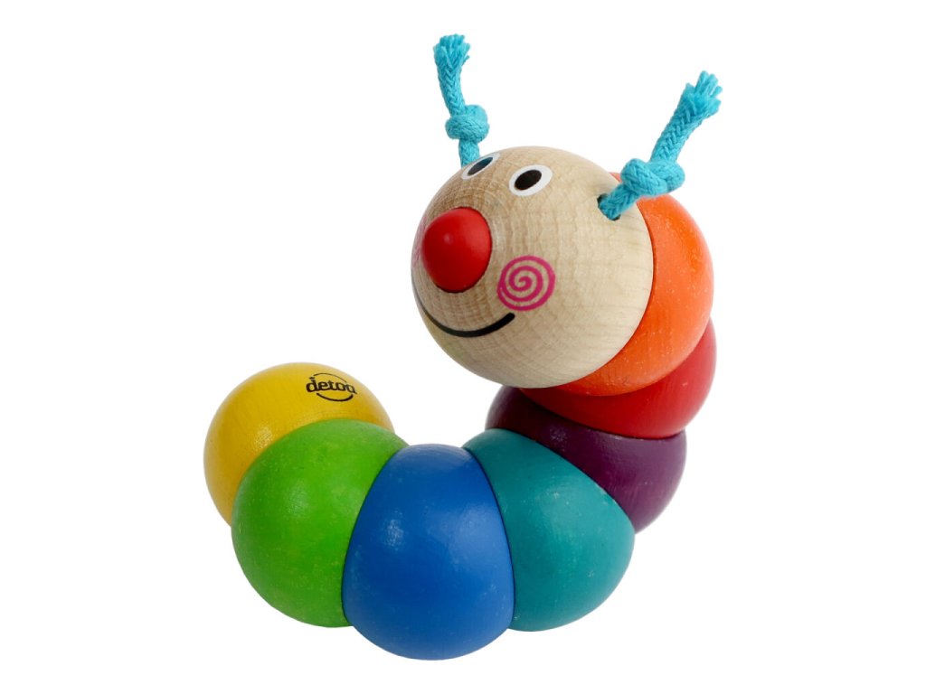 Manipulace s housenkou podporuje rozvoj jemné motoriky, koordinace rukou a vnímání barev. Přírodní dřevo a zdravotně nezávadné zpracování zajišťují bezpečné používání i pro nejmenší děti.