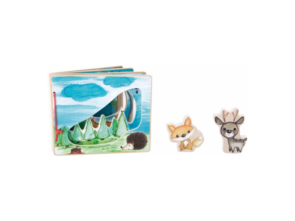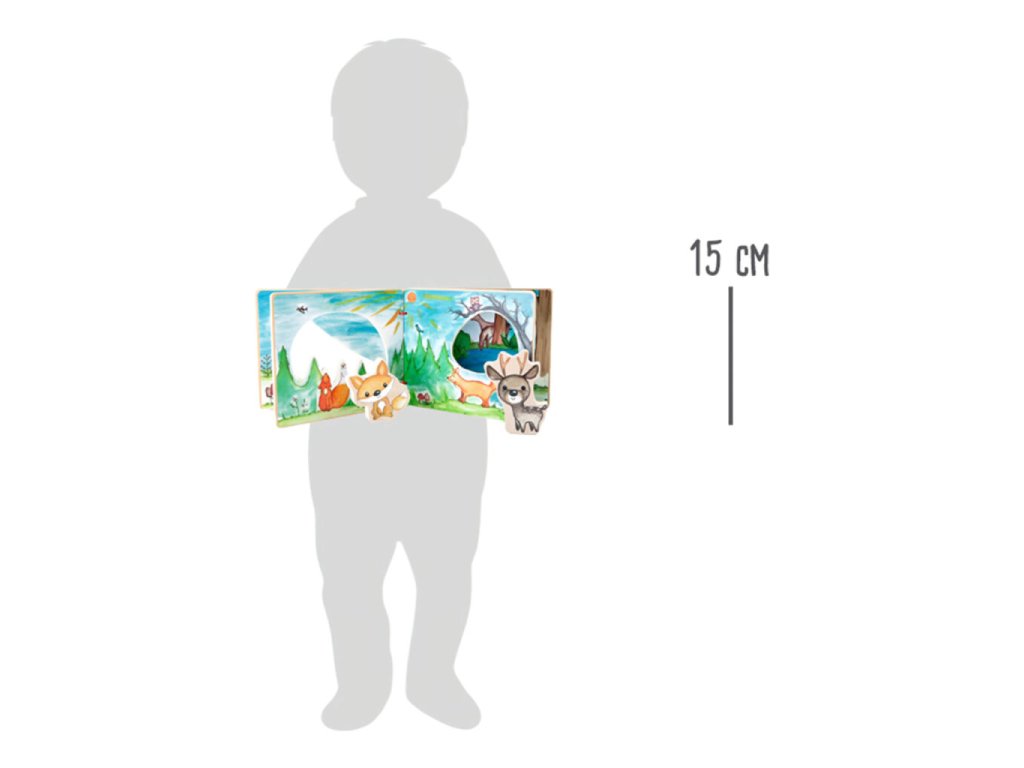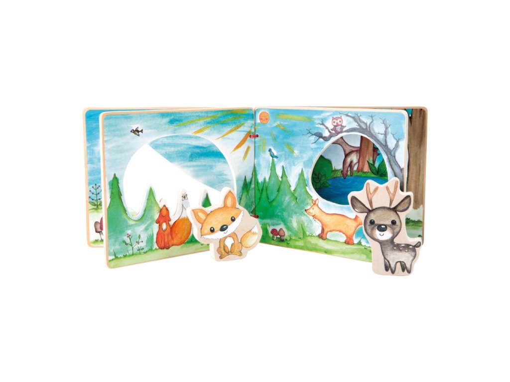 Dřevěná obrázková knížka přenese malé objevitele do hlubokého lesa, kde je na jejich cestě doprovází liška a jelen. Prostřednictvím obrázků a figurek děti hravě poznávají svět přírody, flóru i faunu. Knížka podporuje fantazii, vyprávění příběhů a smyslové vnímání, zároveň je díky pevnému dřevěnému provedení ideální pro malé dětské ruce. Figurkám lze snadno zajistit místo na zadní straně knihy pomocí suchých zipů, což usnadňuje přenášení i ukládání.