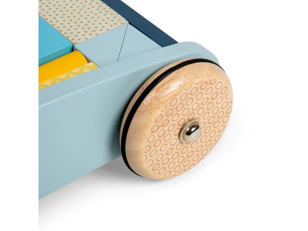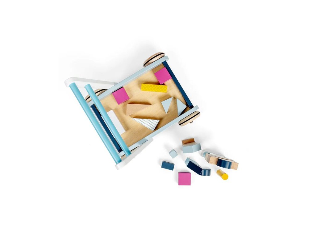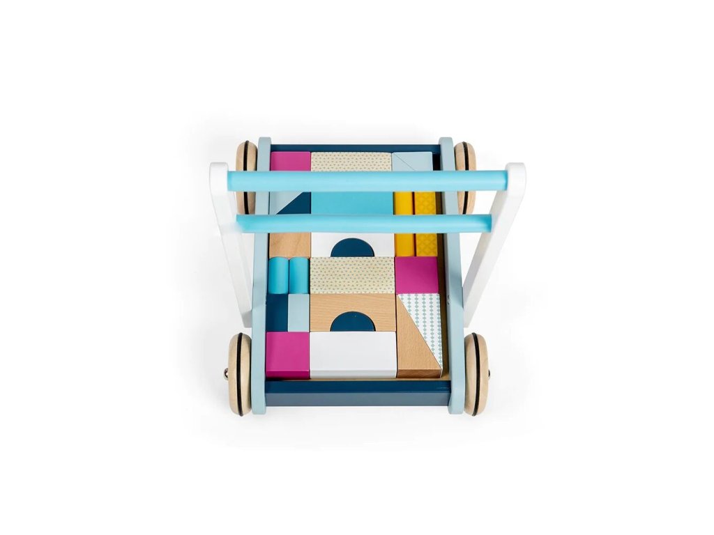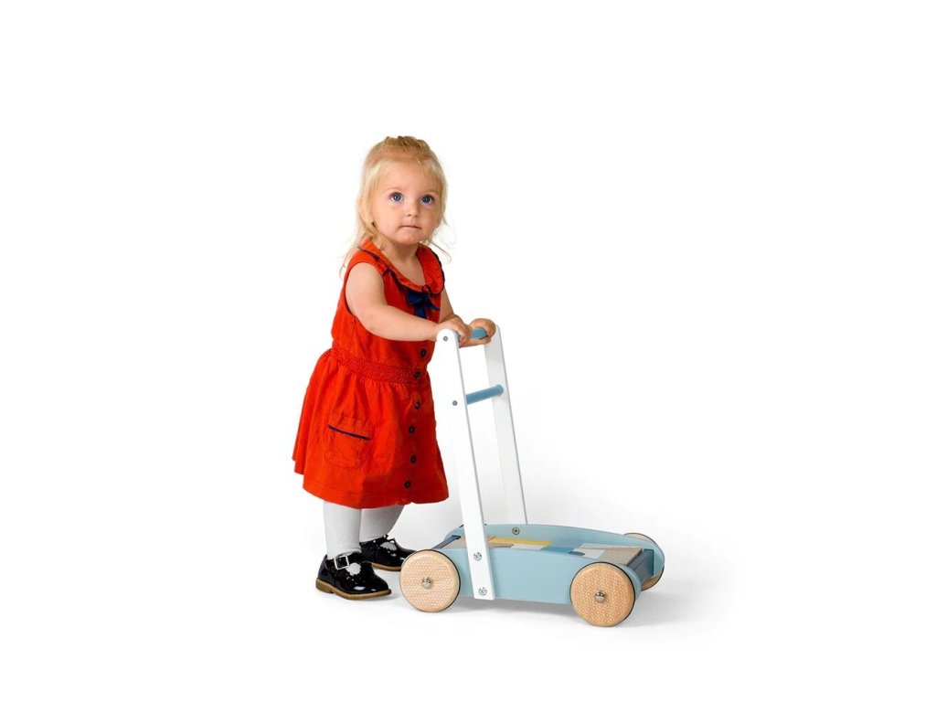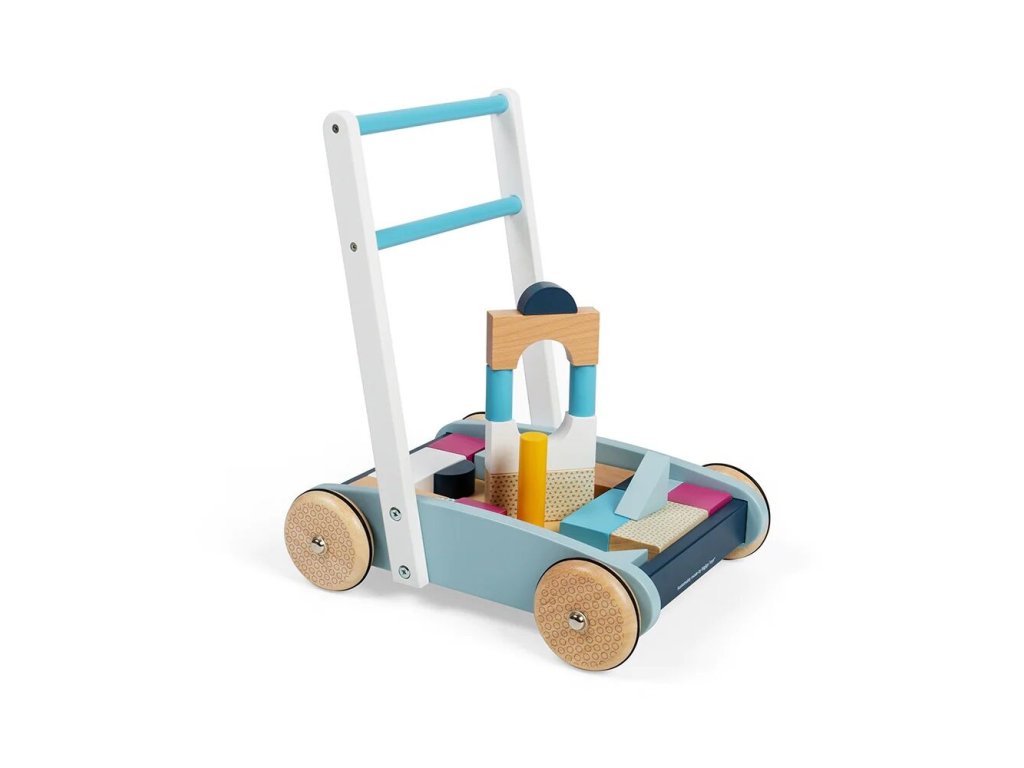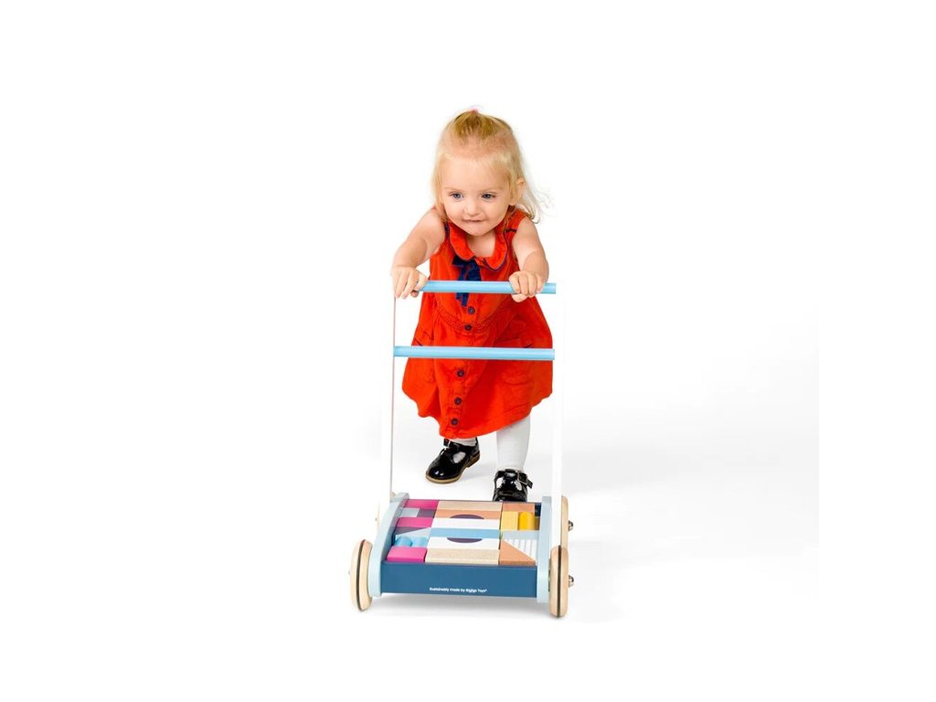 Baby dřevěné chodítko je navrženo pro malé děti od 12 měsíců, které se učí chodit a objevovat svět kolem sebe. Pevná konstrukce z udržitelného FSC dřeva poskytuje stabilní oporu, zatímco snadno uchopitelné madlo dodává dětem pocit jistoty a bezpečí. Pastelový design je malovaný netoxickými barvami a laky, vhodnými pro malé děti. Součástí chodítka je sada 25 dřevěných kostek různých tvarů, barev a velikostí, které lze ukládat do vozíku a využít ke hře i stavění.
