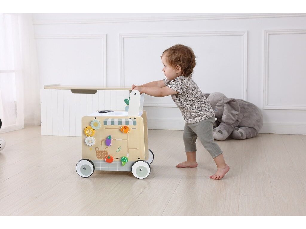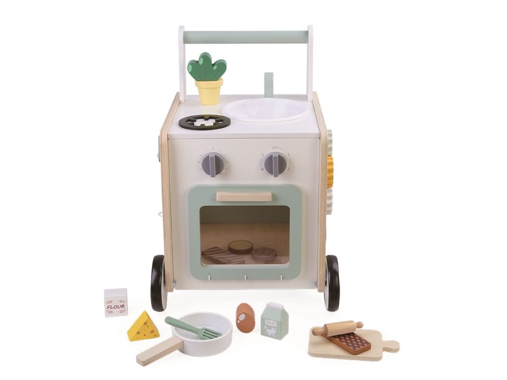 Dřevěné chodítko Kuchyňka je chytrým spojením chodítka a dětské kuchyňky. Pomáhá dítěti při nácviku chůze a zároveň nabízí bohaté možnosti interaktivní hry. Na všech čtyřech stranách chodítka se nachází různé herní prvky, které podporují jemnou motoriku, koordinaci ruka–oko a kreativní myšlení. Stabilní dřevěná konstrukce zajišťuje bezpečnost při pohybu a dlouhou životnost hračky.