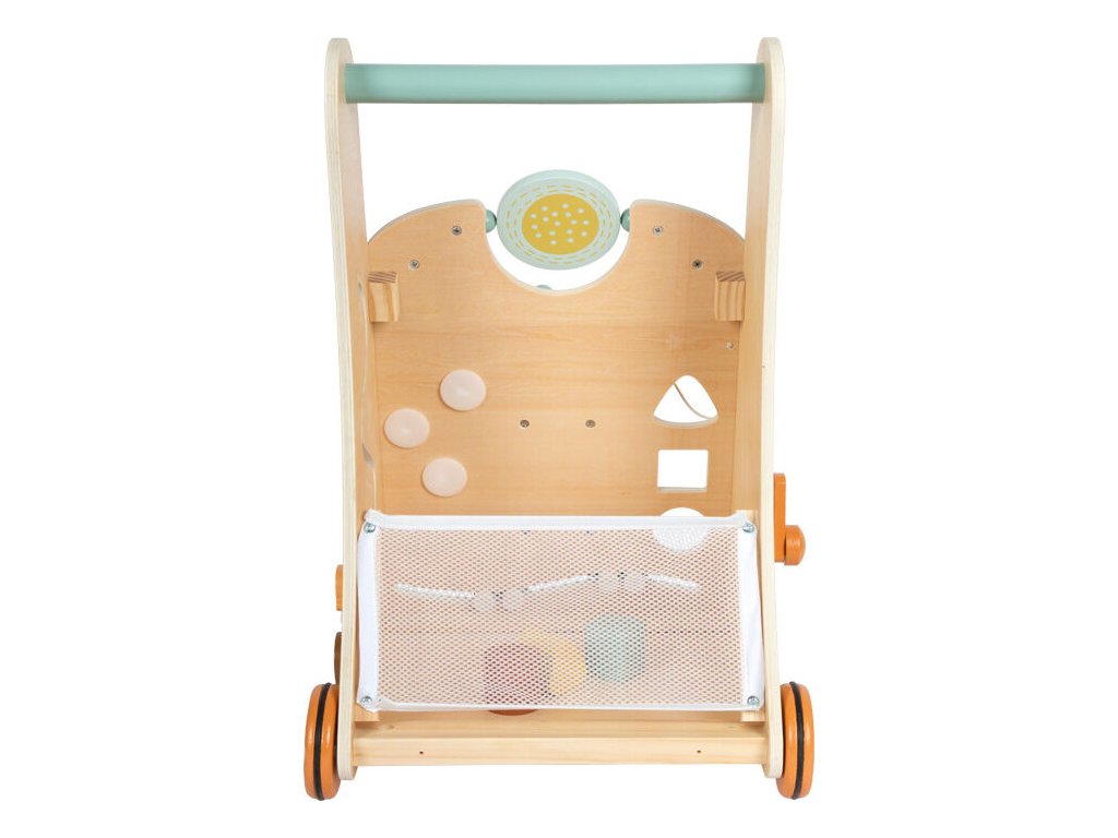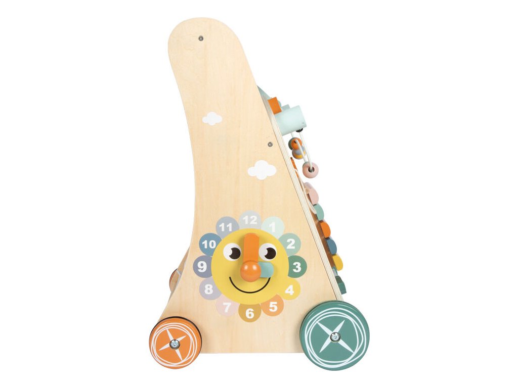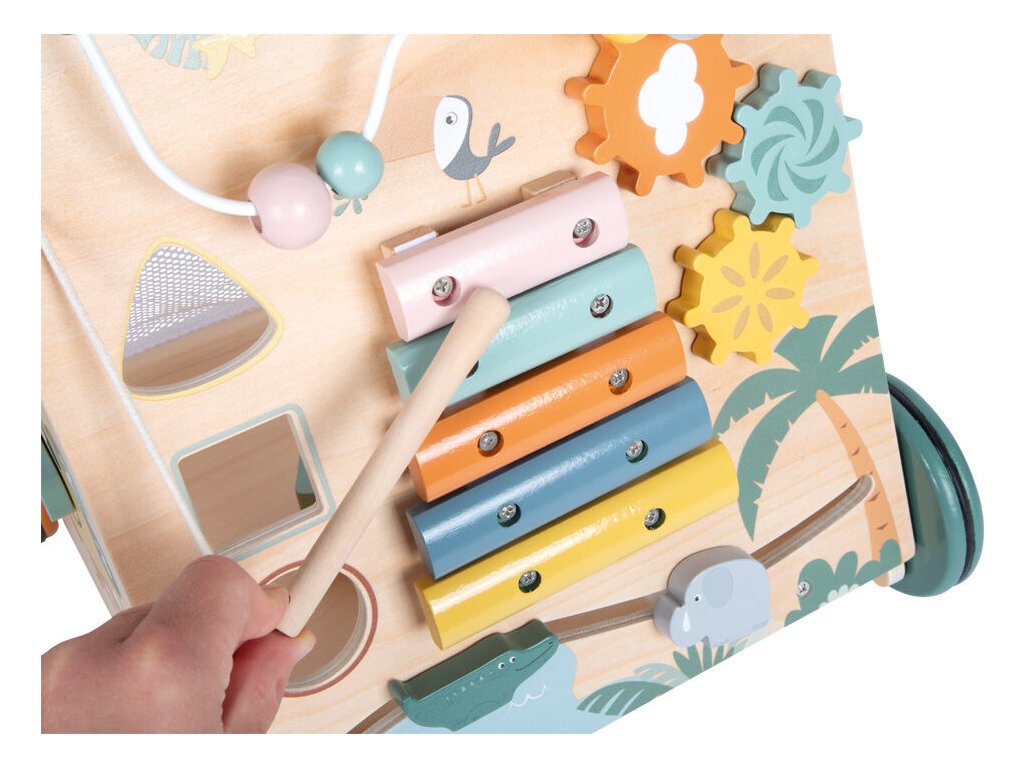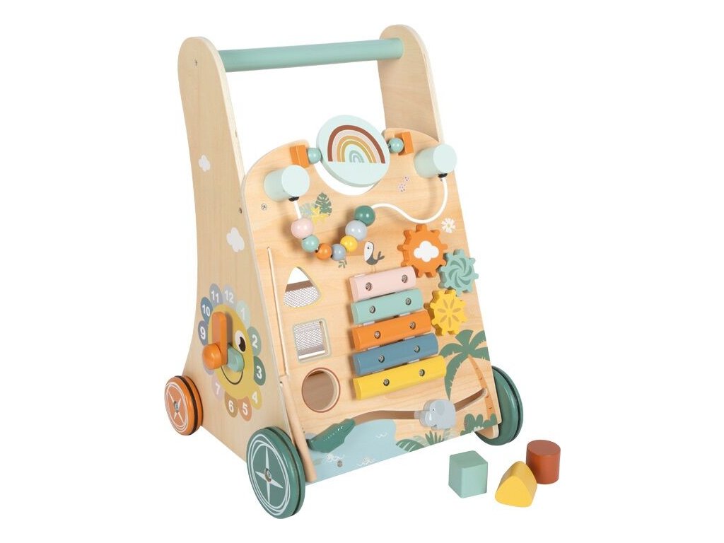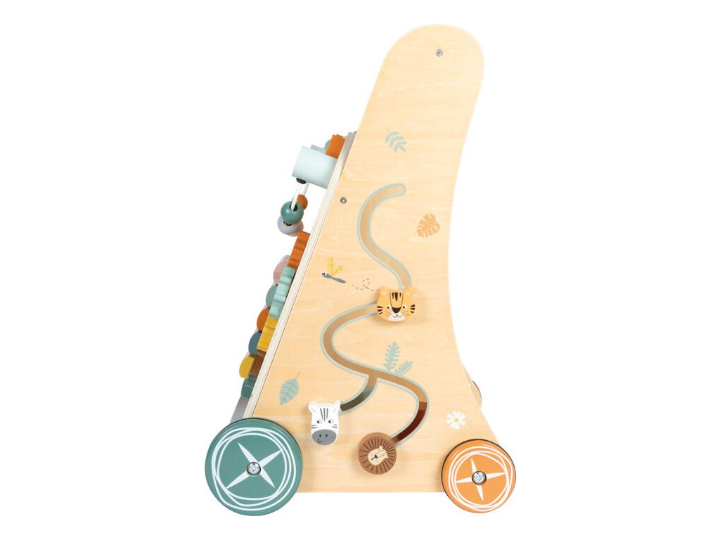 Dětské chodítko Safari zve malé objevitele na dobrodružnou výpravu mezi zvířata africké savany. Stabilní chodítko s trojúhelníkovým tvarem nabízí tři herní stěny plné aktivit, které děti doprovází při jejich prvních krůčcích a zároveň podporují rozvoj smyslů i motorických dovedností. Na chodítku děti objeví slona, krokodýla, lva, tygra, zebru, tukana a další zvířecí kamarády, kteří promění každou hru v nové safari dobrodružství. Součástí je dřevěný xylofon s 5 klávesami pro akustickou stimulaci, korálkový labyrint, posuvné prvky, ozubená kola, překlápěcí destičky, vkládačka se 3 kostkami i hodiny s pohyblivými ručičkami, které podporují učení hrou. Na zadní straně chodítka se nachází praktický síťovaný úložný prostor na hračky. Pogumovaná kola zajišťují tichou, plynulou a bezpečnou jízdu bez prokluzování. Jemné pastelové barvy v kombinaci s přírodním dřevem dělají z chodítka nejen funkční hračku, ale i krásný doplněk dětského pokoje.