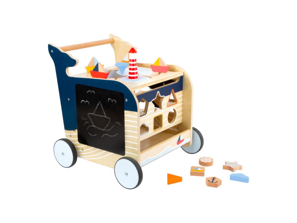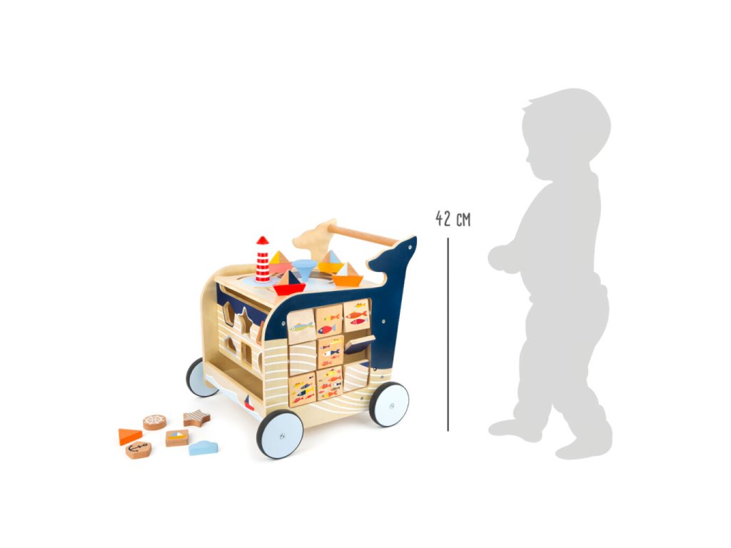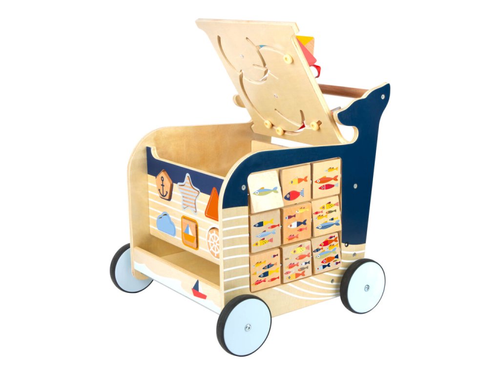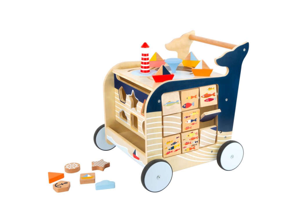 Dřevěné chodítko Velryba je ideálním společníkem pro děti, které se učí chodit a objevovat svět kolem sebe. Originální design inspirovaný mořským světem zaujme na první pohled a zároveň nabídne bohaté možnosti hry. Na všech čtyřech stranách chodítka se nachází různorodé herní prvky, které podporují rozvoj jemné motoriky, koordinace a logického myšlení. Děti si mohou procvičit vkládání tvarů, otáčení obrázků, kreslení na tabulku, naučit se počítat, rozlišovat roční období nebo světové strany. Chodítko je vybaveno pogumovanými koly, která zajišťují tichý a plynulý pohyb. Integrovaný brzdný systém zvyšuje bezpečnost při prvních krůčcích. Horní část chodítka je otevíratelná a slouží jako praktický úložný prostor na kostky či jiné hračky, přičemž dvířka jsou opatřena pojistkou proti přivření prstů. Robustní konstrukce z kvalitních materiálů zaručuje stabilitu a dlouhou životnost.