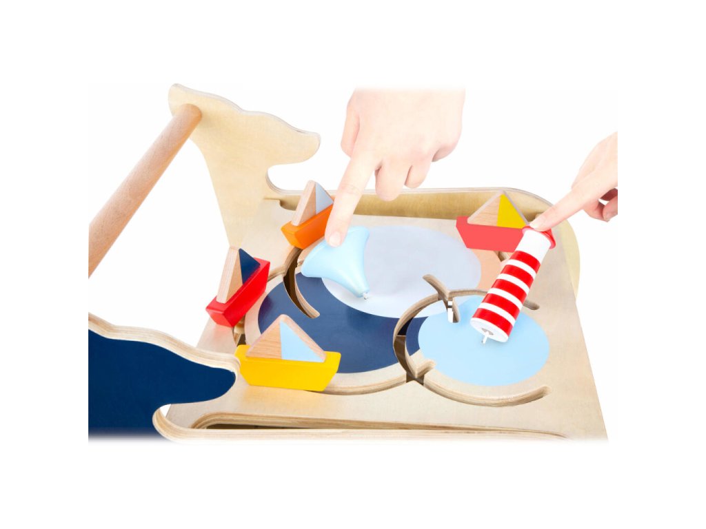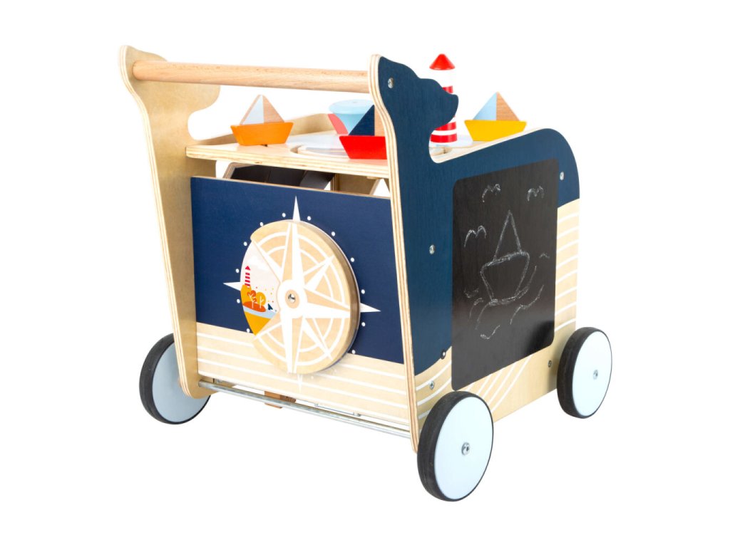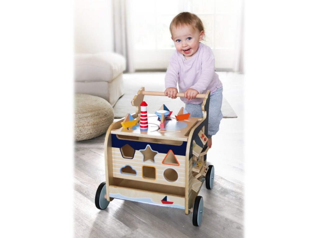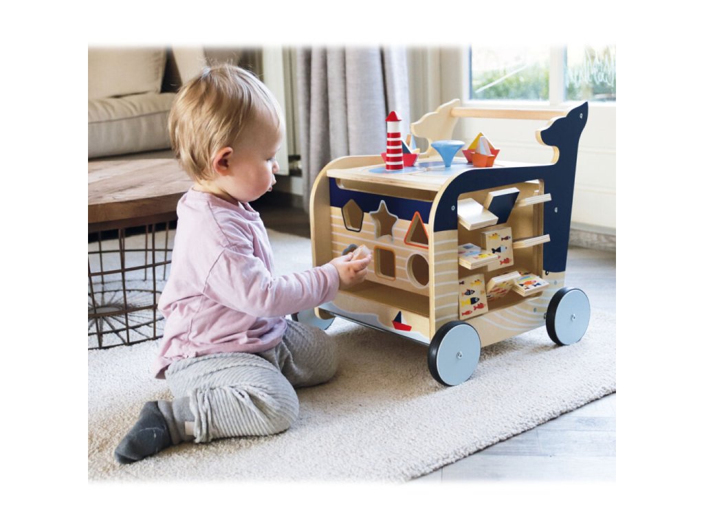 Dřevěné chodítko Velryba je ideálním společníkem pro děti, které se učí chodit a objevovat svět kolem sebe. Originální design inspirovaný mořským světem zaujme na první pohled a zároveň nabídne bohaté možnosti hry. Na všech čtyřech stranách chodítka se nachází různorodé herní prvky, které podporují rozvoj jemné motoriky, koordinace a logického myšlení. Děti si mohou procvičit vkládání tvarů, otáčení obrázků, kreslení na tabulku, naučit se počítat, rozlišovat roční období nebo světové strany. Chodítko je vybaveno pogumovanými koly, která zajišťují tichý a plynulý pohyb. Integrovaný brzdný systém zvyšuje bezpečnost při prvních krůčcích. Horní část chodítka je otevíratelná a slouží jako praktický úložný prostor na kostky či jiné hračky, přičemž dvířka jsou opatřena pojistkou proti přivření prstů. Robustní konstrukce z kvalitních materiálů zaručuje stabilitu a dlouhou životnost.