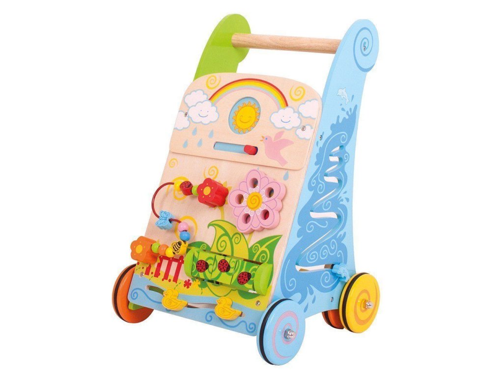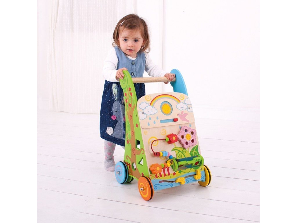 Dřevěné aktivní chodítko Zahrada nabízí dětem hravou cestu k prvním krůčkům i objevování světa kolem sebe. Je inspirováno přírodou a plné pestrých, podnětných aktivit. Pomocí posuvníku si děti mohou vybrat mezi měsícem a sluncem, roztočit barevnou květinu, spojovat berušky či čmeláky otáčením kostek nebo pohybovat beruškou, čmelákem a motýlem po korálkovém drátu z květiny na květinu. Nechybí ani kachny připravené k plavbě po vodní dráze. Každá strana chodítka nabízí další zábavu – pohybujícího se delfína a třídič tvarů se třemi barevnými dílky, z nichž každý představuje jiné zvíře. Robustní rukojeť je přizpůsobena malým ručičkám a pestrobarevná kolečka zajišťují plynulý a bezpečný pohyb. Chodítko je vyrobeno z kvalitních, zodpovědně získaných materiálů a splňuje aktuální evropské bezpečnostní normy.