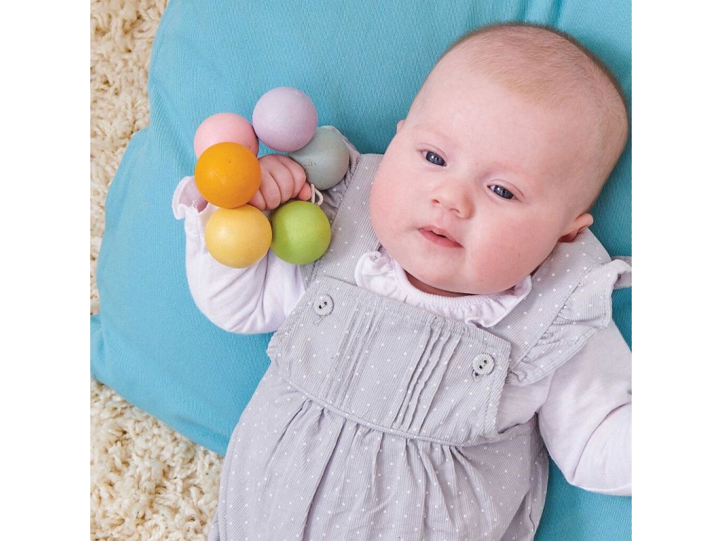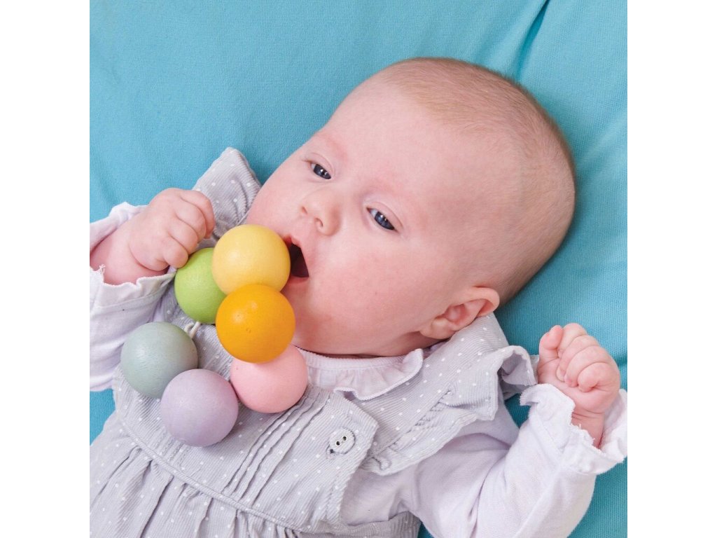 Šest dřevěných korálků má ideální velikost pro malé dětské ručky. Jsou ručně domalované pastelovými, netoxickými barvami na vodní bázi, které jsou bezpečné i při vkládání do úst. Při uchopení, kousání a manipulaci hračka podporuje rozvoj jemné motoriky, smyslového vnímání i koordinace ruky a oka.