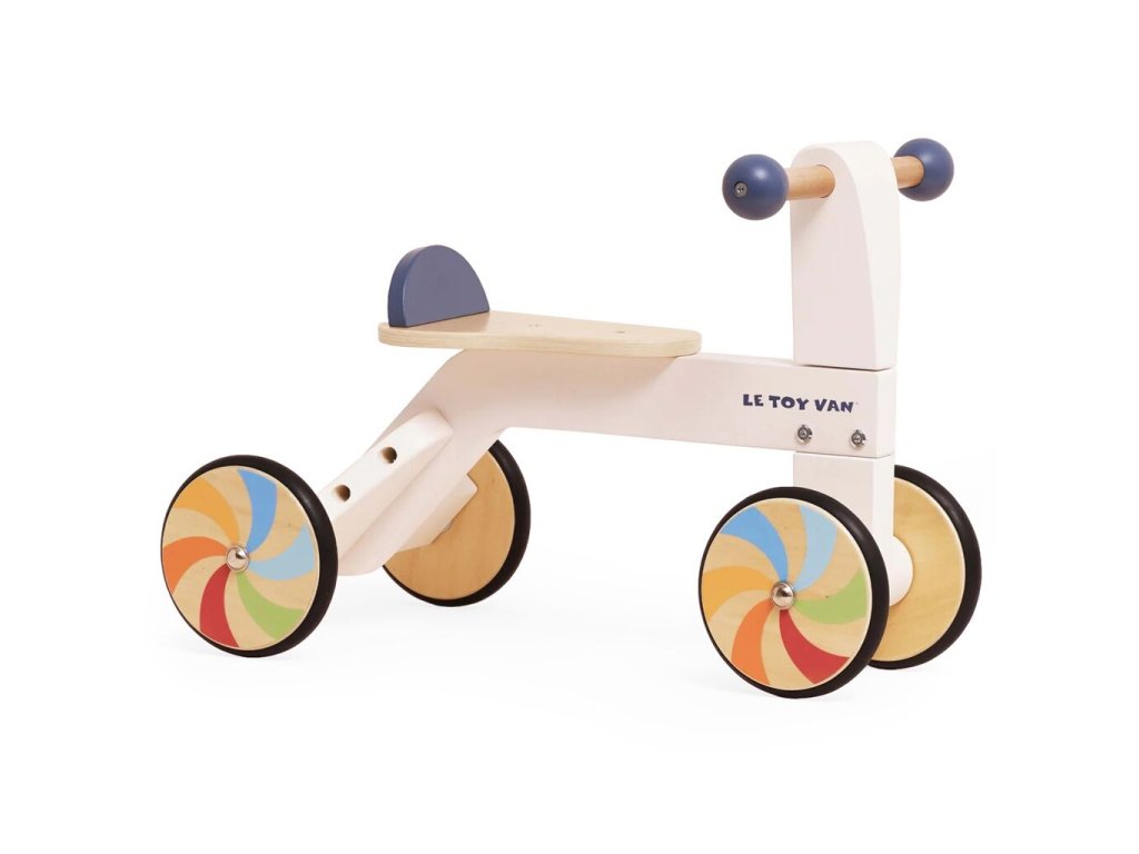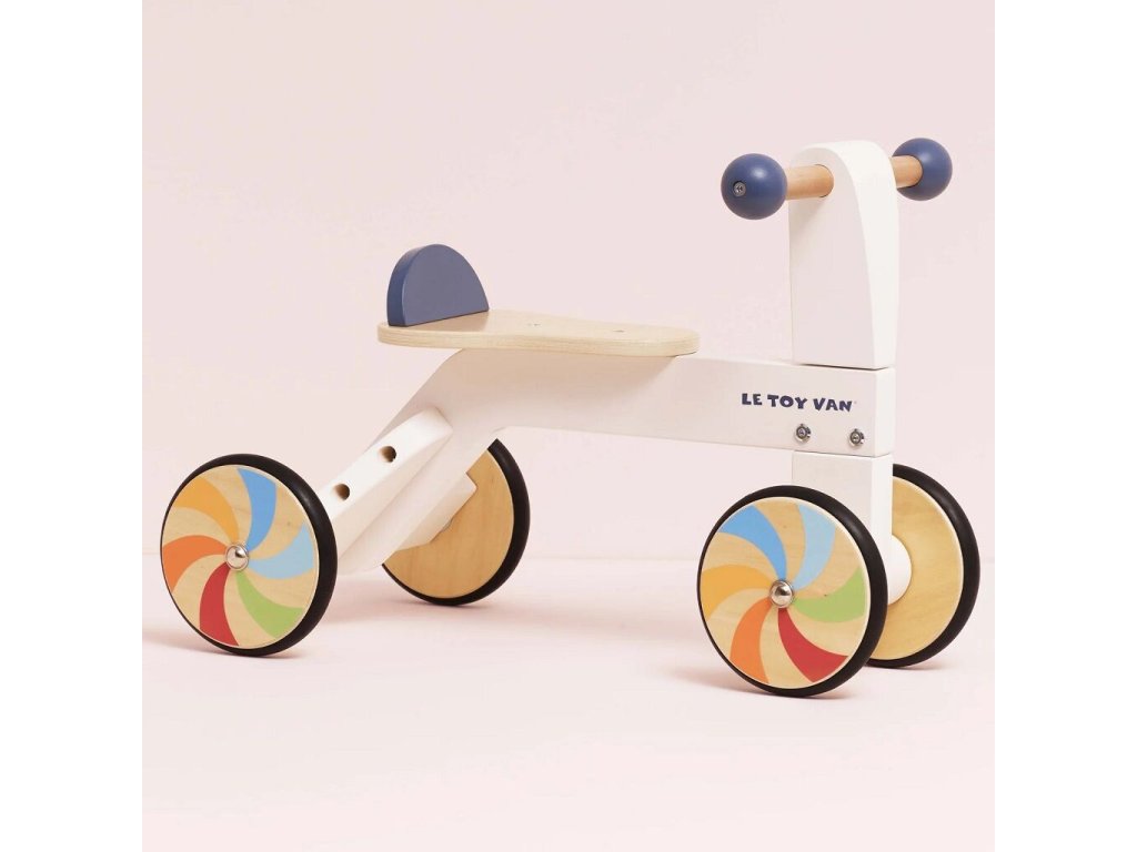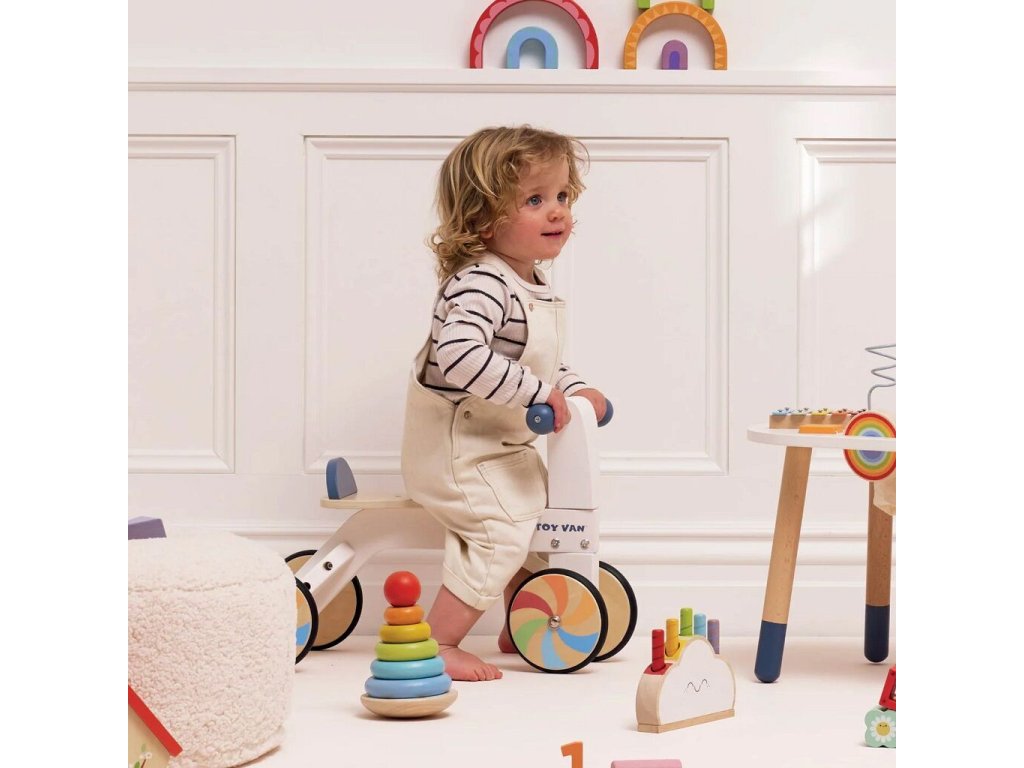 Toto elegantně navržené duhové odrážedlo je vyrobeno eticky z FSC certifikovaného dřeva a ručně domalováno ekologickými barvami na vodní bázi. Jemné barevné provedení a kolečka v barvách duhy z něj dělají výrazný a zároveň nadčasový doplněk dětského světa. Díky pohodlnému sedátku a snadno ovladatelným řídítkům je ideální pro první samostatné projížďky. Odrážedlo podporuje rozvoj rovnováhy, koordinace a kognitivních dovedností a zároveň inspiruje k představivé hře doma i venku.