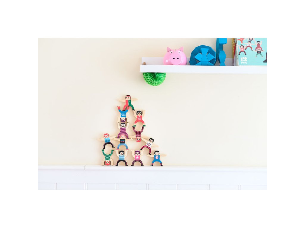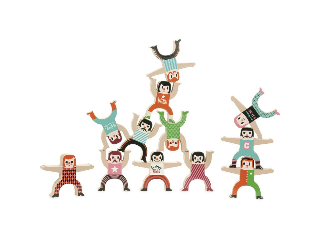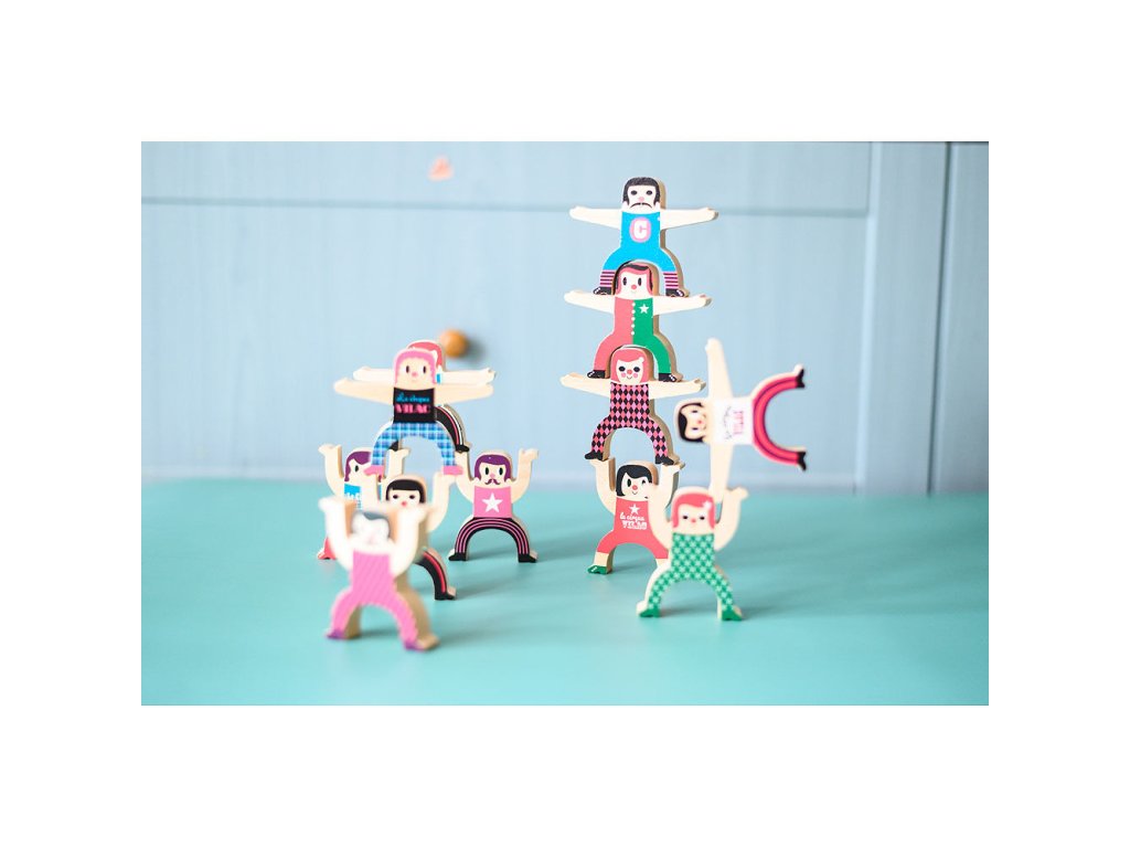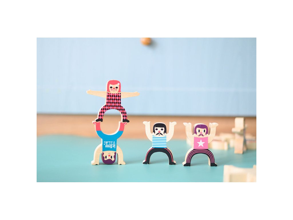 Dřevěné postavičky akrobatů tvoří sada dvanácti originálně ilustrovaných figurek, se kterými si děti mohou zahrát napínavou balanční hru. Úkolem je skládat jednotlivé postavičky na sebe tak, aby vytvořily stabilní akrobatickou věž. Každý chybný pohyb může způsobit pád celé konstrukce, což přirozeně rozvíjí trpělivost, soustředění a schopnost plánování. Hra podporuje jemnou motoriku, koordinaci rukou a očí i logické uvažování. Díky jednoduchým pravidlům je vhodná jak pro samostatnou hru, tak pro hraní s rodinou nebo kamarády. Veselé ilustrace dodávají hračce hravý a nadčasový vzhled.