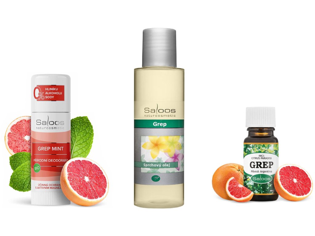 Najdete v ní BIO přírodní deodorant grep–máta bez sody a hliníku, sprchový olej grep pro očistu a hydrataci pokožky a esenciální olej grep, který povzbudí smysly a pročistí vzduch.