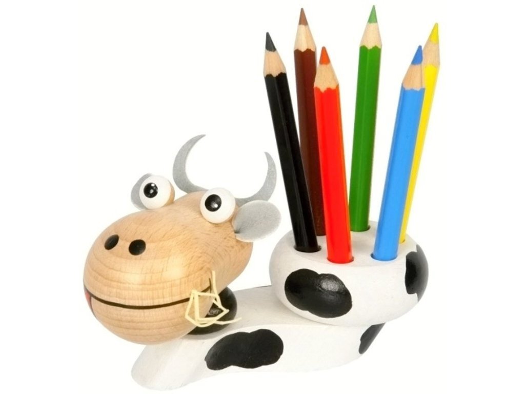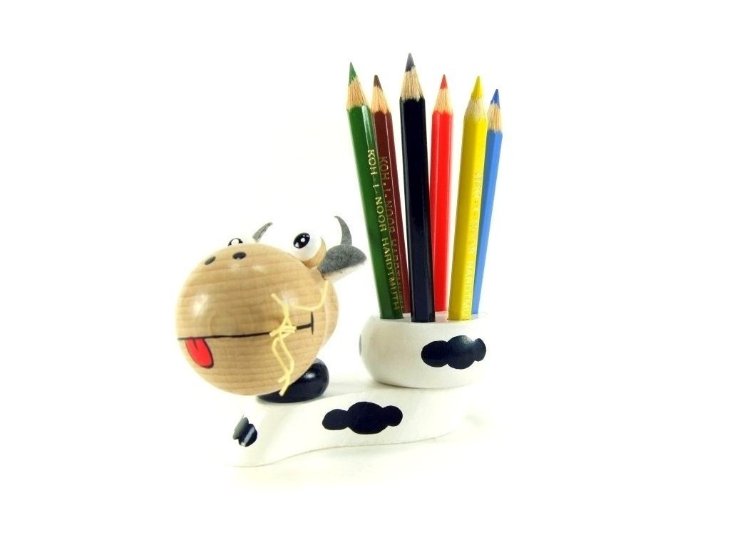 Dřevěný stojánek ve tvaru kravičky je krásným a zároveň praktickým pomocníkem na dětský stůl. Pomáhá udržet pořádek, podporuje jemnou motoriku a zároveň slouží jako hravá dekorace, která rozveselí každý dětský koutek.