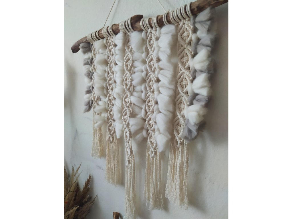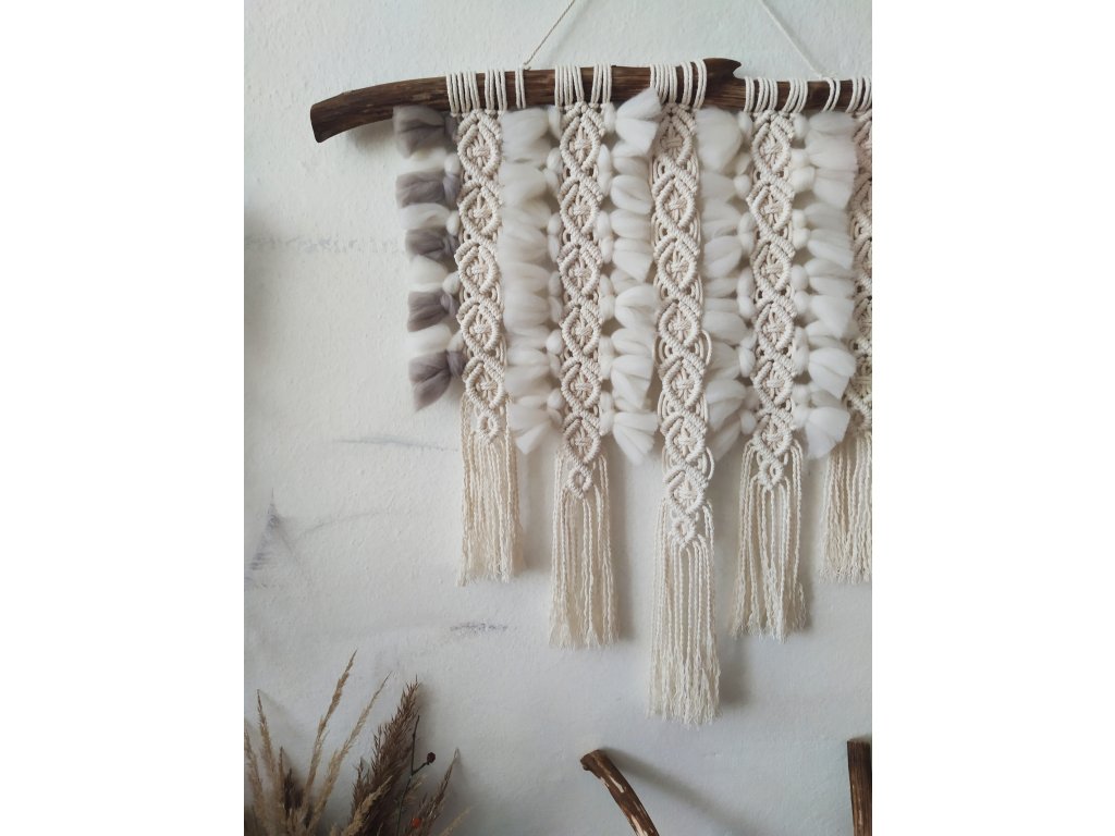 Macramé „ALASKA“ je jedinečný kousek, který v sobě nese pocit nespoutané přírody – zimy, hor, ticha i síly živlů. Kombinuje přírodní materiály a ruční zpracování tak, aby působilo autenticky, živě a lehce divoce. Základem jsou macramé šňůry o průměru 3 mm ze 100% kroucené bavlny, doplněné o vlněné a merino česance, které vytvářejí měkkou strukturu a „surový“ vzhled inspirovaný přírodními prvky.