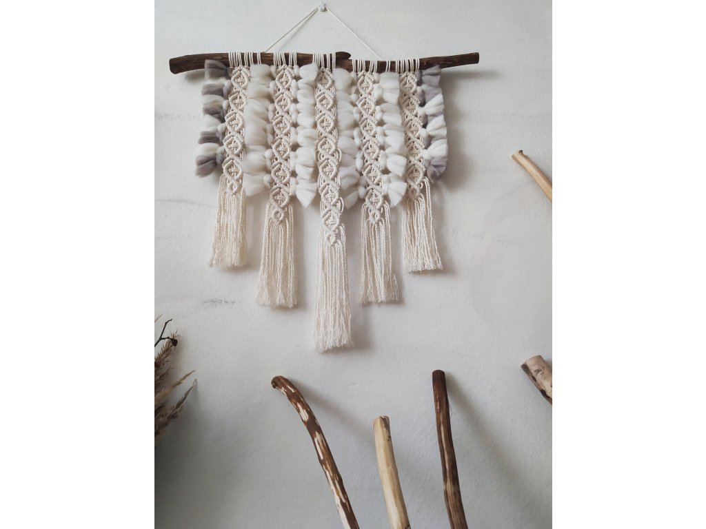 Dekorace je zavěšena na přírodním dřevu či větvi, což každému kusu dodává neopakovatelný charakter a propojení s přírodou. V barevném ladění převládá světlý natural odstín doplněný o hedvábně šedé tóny, které působí harmonicky a zároveň silně. Součástí je i poutko na zavěšení, ale lze ji připevnit i bez něj pouhým podepřením větve o stěnu.