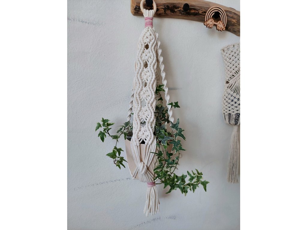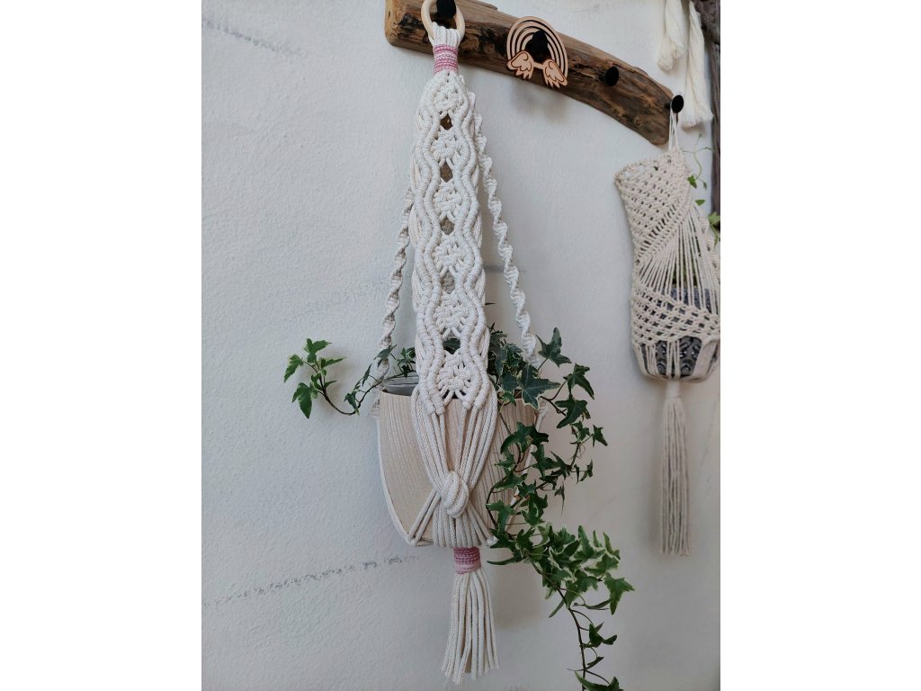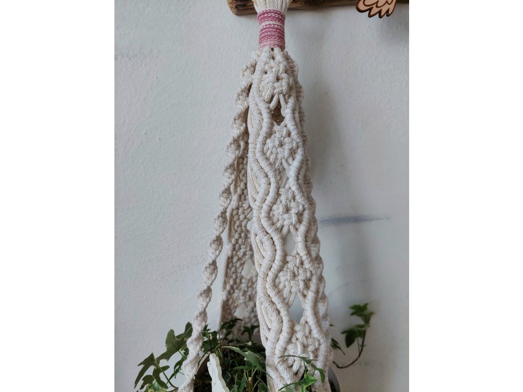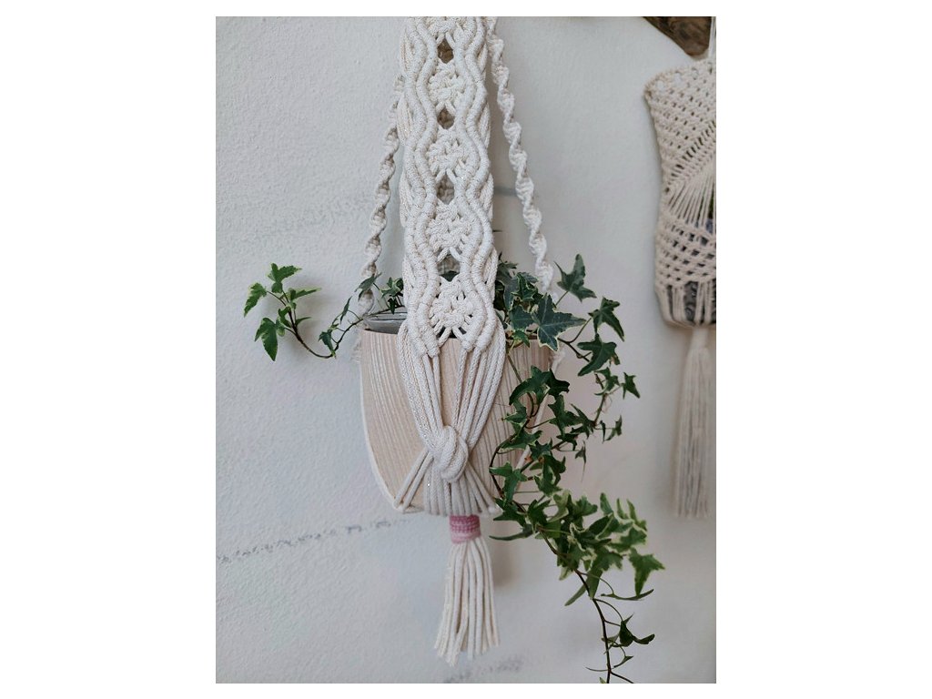 Závěs jednoduše zavěste pomocí dřevěného kroužku na háček či tyč. Umístěte květináč do středu uzlů tak, aby byl stabilně uložen. Doporučeno pro větší nebo středně velké květináče, kde nejlépe vynikne struktura vzoru.