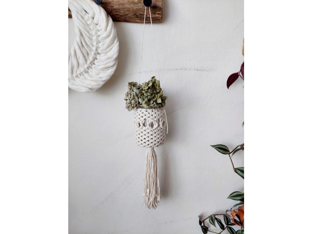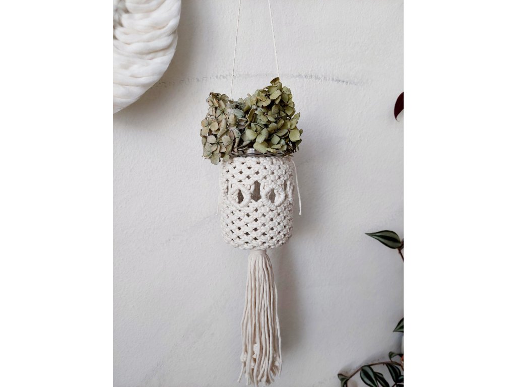 Závěsná macramé dekorace, kterou můžete použít jako lucerničku, vázu nebo malý květináč, je originálním a plně funkčním doplňkem do interiéru. Díky jemnému, ručně vázanému vzoru krásně světélkuje, pokud do skleničky vložíte světelný řetěz nebo čajovou svíčku. Stejně dobře poslouží i jako závěsná váza na květiny – uvnitř je kvalitní recyklovaná sklenice, která dekoraci dodává stabilitu i praktické využití.
