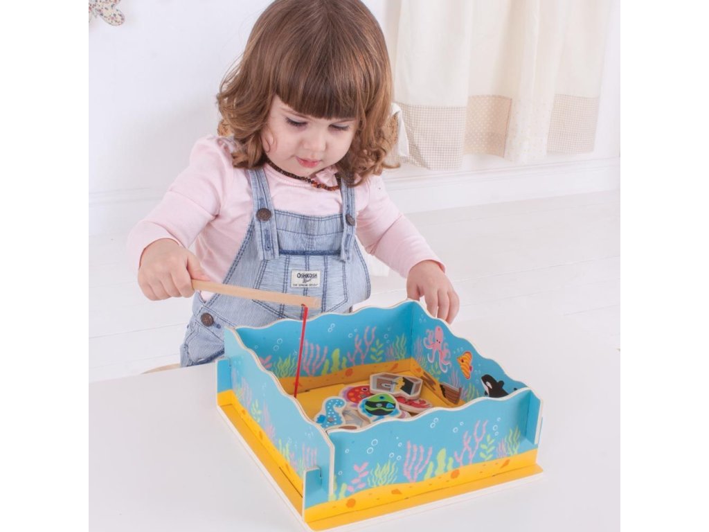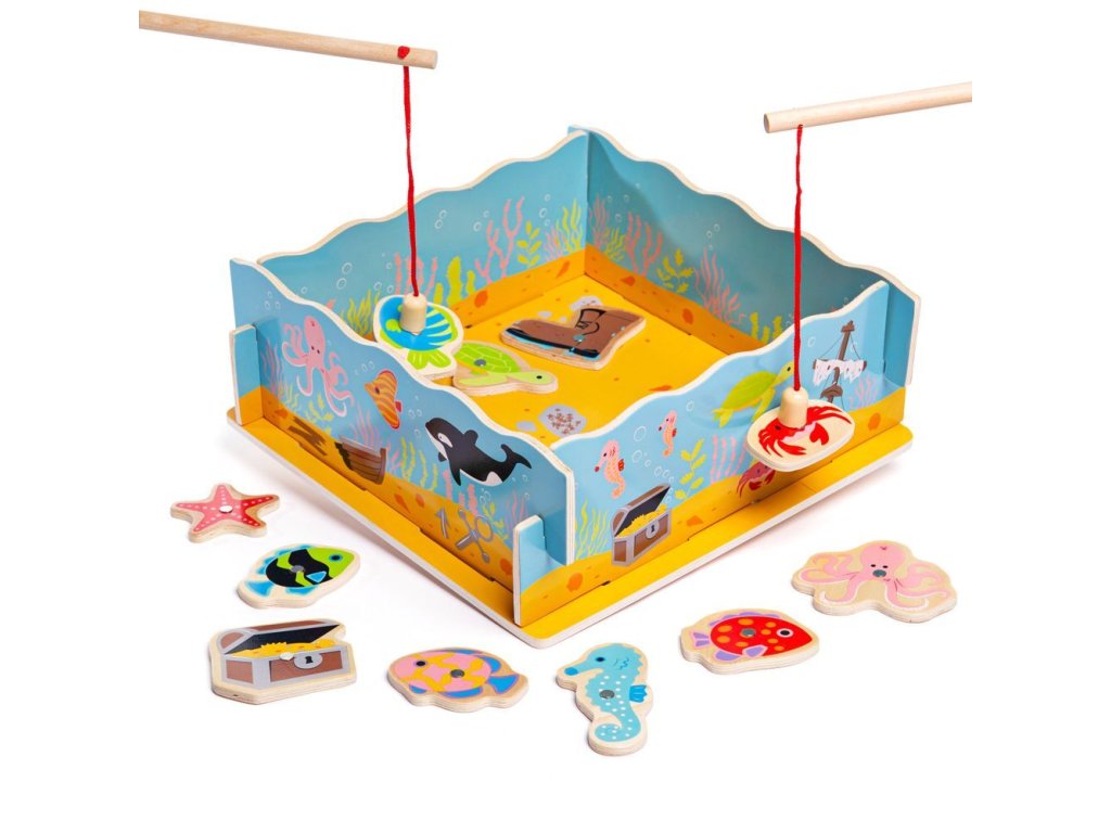 Magnetické chytání rybiček je klasická dětská hra, která vyžaduje šikovnost, trpělivost a soustředění. Děti pomocí magnetických prutů loví jednotlivé rybičky a další předměty z mořské konstrukce a následně je musí správně umístit zpět do odpovídajících otvorů. Hra podporuje rozvoj jemné motoriky, koordinace ruka-oko i prostorového vnímání. Součástí sady je 11 barevných rybiček, truhla s pokladem, bota a kotva, které hru zpestřují a podporují fantazii. Robustní konstrukce moře se dvěma rybářskými pruty umožňuje hru více dětem současně. Vyrobeno z kvalitního dřeva z odpovědných zdrojů, splňuje aktuální evropské bezpečnostní normy a je vhodné pro každodenní hraní.
