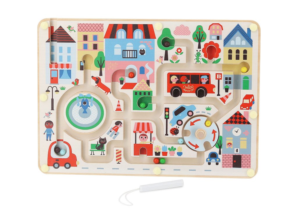 Magnetický labyrint Moje město zve děti do poetického světa města. Pomocí magnetického pera děti provázejí barevné kuličky městem a umisťují je na správná místa – do stromu, květiny nebo kol autobusu. Hra přirozeně rozvíjí jemnou motoriku, koordinaci ruka–oko a orientaci v prostoru a zároveň podporuje rozšiřování slovní zásoby při pojmenovávání barev, zvířat a předmětů.