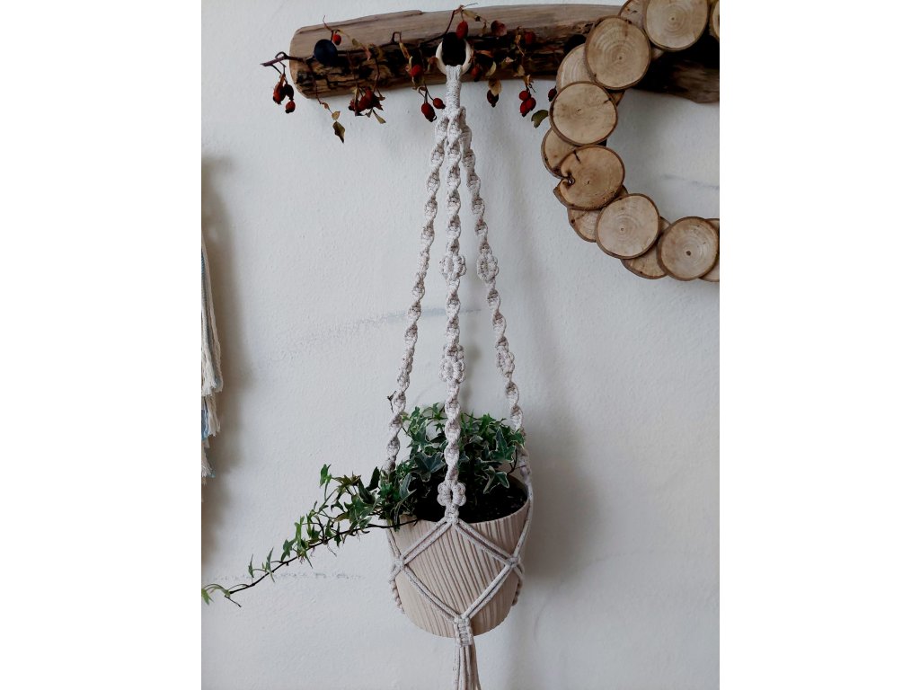 Závěs zavěste pomocí dřevěného kroužku na háček či tyč. Umístěte květináč do středu uzlů a zkontrolujte jeho rovnoměrné usazení.