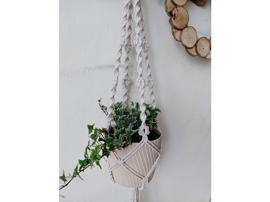 Minimalistický macramé závěs na květináč je univerzální dekorací, která díky své jednoduchosti a přírodnímu materiálu zapadne do jakéhokoli interiéru. Ručně tvořený z kvalitních recyklovaných bavlněných šňůr o tloušťce 5 mm poskytuje dostatečnou pevnost i stabilitu pro větší průměry květináčů, ale krásně vynikne s jakoukoli velikostí. Závěs nemá přední ani zadní stranu a je plně pohledový ze všech úhlů, což jej dělá ideálním pro zavěšení do prostoru. Díky jednoduchému stylu dokáže okamžitě dodat interiéru novou energii a pozornost na rostliny, které v něm budou umístěny.
