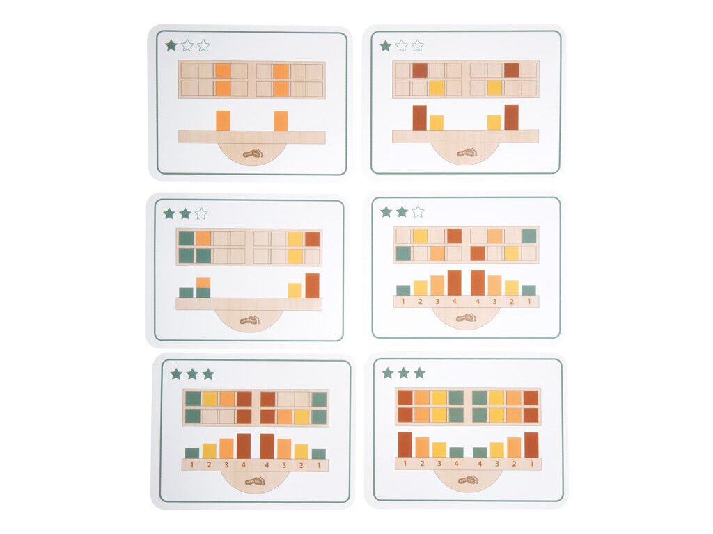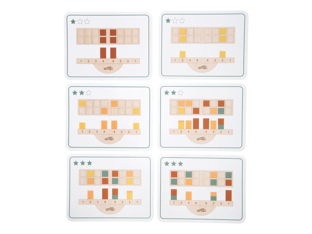 Součástí hry jsou inspirační kartičky s úkoly a různými stupni obtížnosti, které umožňují přizpůsobit hru věku i schopnostem dítěte. Na balanční houpačce jsou vyznačena čísla, která dětem pomáhají lépe chápat vztah mezi polohou, hmotností a rovnováhou – přesně v duchu Montessori pedagogiky.