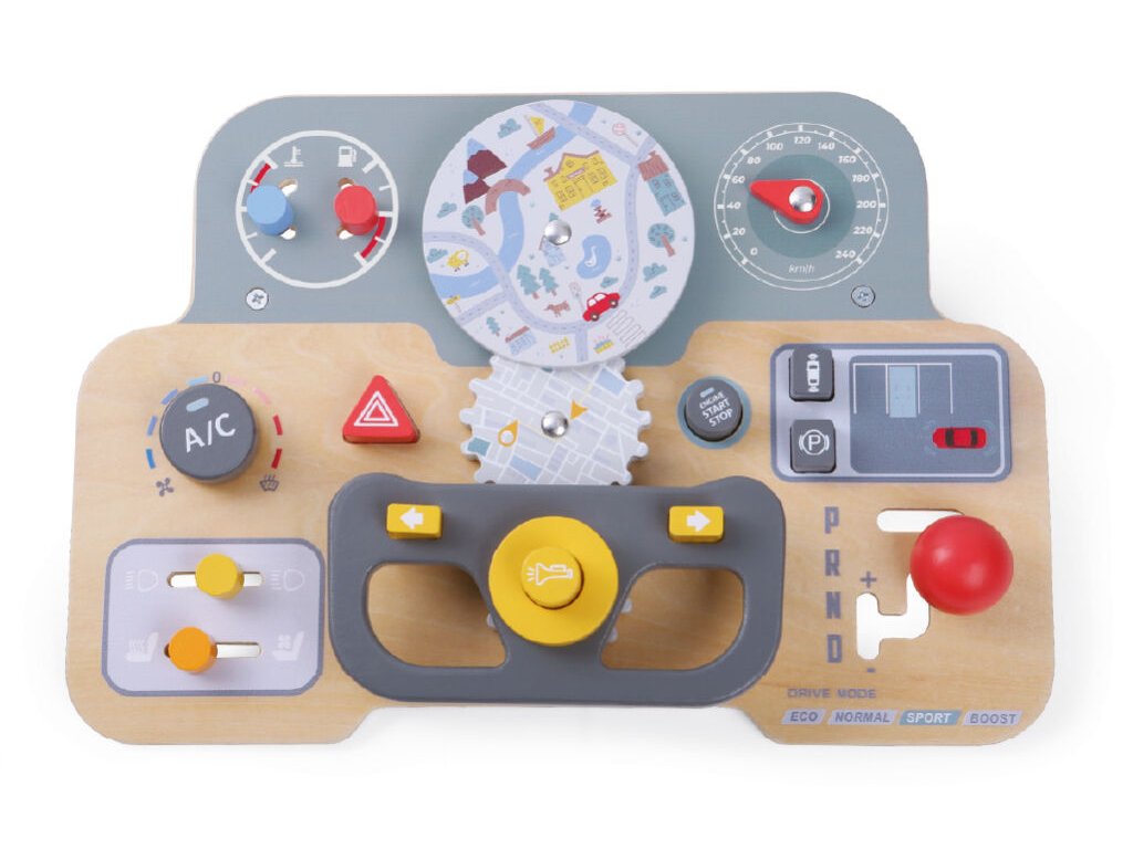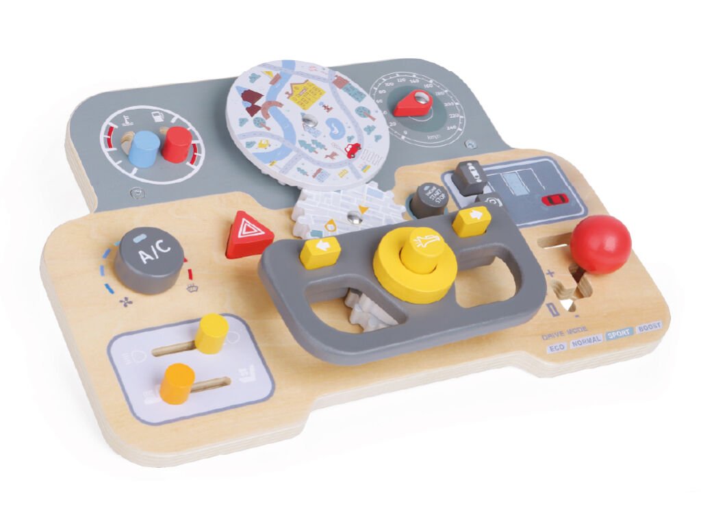 Auto deska je zábavná motorická hrací deska, která děti vtáhne do světa řízení a dobrodružství. Interaktivní prvky, jako jsou tlačítka, otočná kolečka a cvakací části, umožňují dětem procvičovat posouvání, otáčení i stisk, a tím rozvíjet jemnou motoriku a koordinaci ruka–oko. Dominantou desky je volant, který posouvá představivou hru ještě dál, a zvuk troubení, jenž hru obohacuje o smyslový zážitek. Stylový moderní design osloví kluky i holky a deska se stane oblíbeným prvkem dětského pokoje.