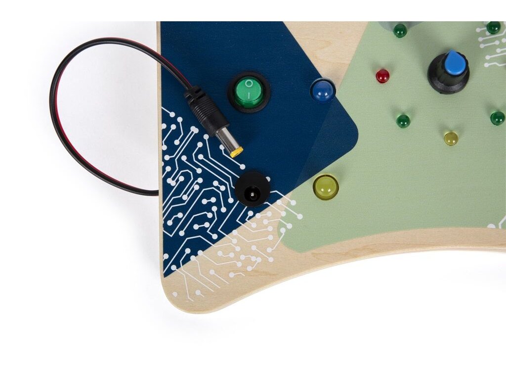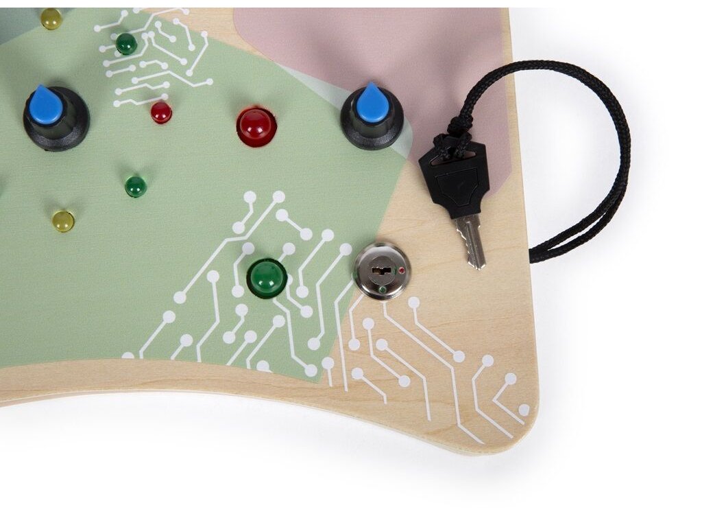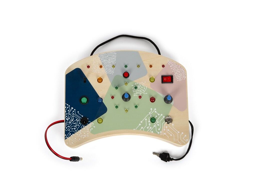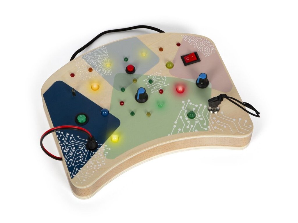 Elektronická motorická deska je vyrobena z kvalitního dřeva a navržena tak, aby dětem nabídla bezpečné a smysluplné objevování světa elektroniky. Různorodé interaktivní prvky – tlačítka, otočné a páčkové spínače, klíč se zámkem i zástrčka – rozvíjejí jemnou motoriku, soustředění a logické myšlení. LED světla upoutají pozornost dítěte a pomáhají mu pochopit, jak jednotlivé úkony ovlivňují výsledek. Ergonomický tvar, praktický popruh a tvarovaná spodní strana zajišťují pohodlnou manipulaci i pro menší dětské ruce.