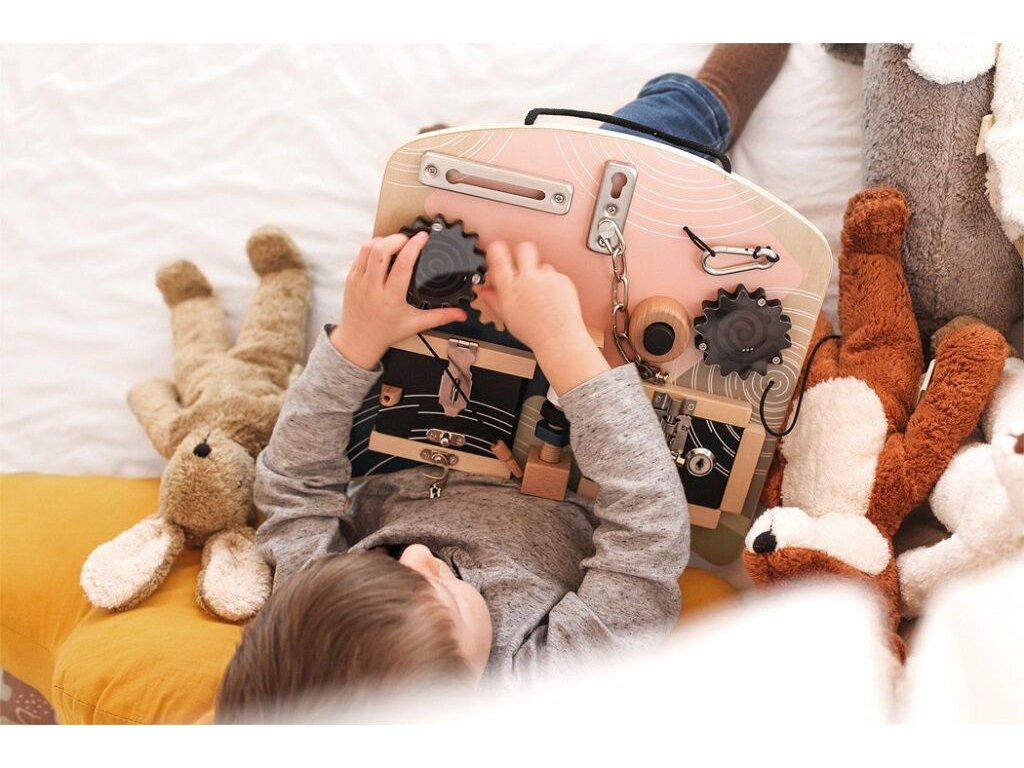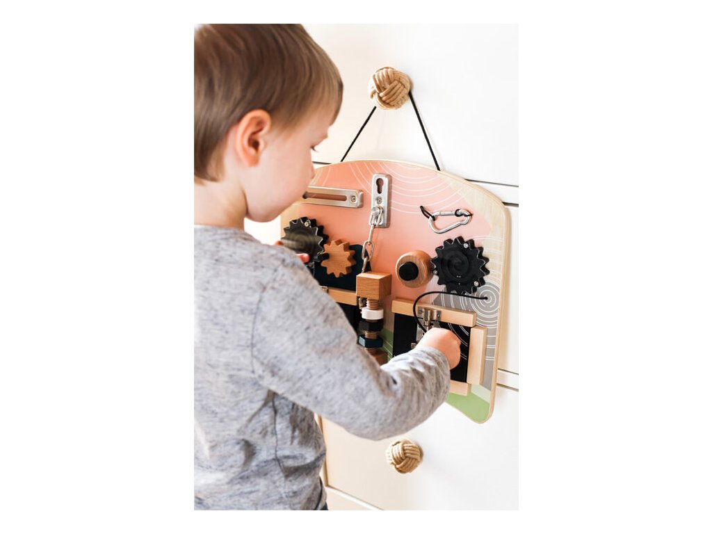 Motorická deska v moderních, trendových barvách s viditelným dřevem nabízí dětem širokou škálu motorických a smyslových aktivit. Různé zámky a zapínání, které děti znají z běžného života, jim umožňují procvičovat praktické dovednosti zábavnou formou. Deska je doplněna o ozubená kola s mini-bludištěm, závitovou tyč s otočnými vertikálními prvky a pískací klakson, které zvyšují atraktivitu hry. Díky ergonomickému tvaru lze desku pohodlně používat na klíně i před dítětem, praktický úchyt umožňuje snadné přenášení nebo zavěšení.
