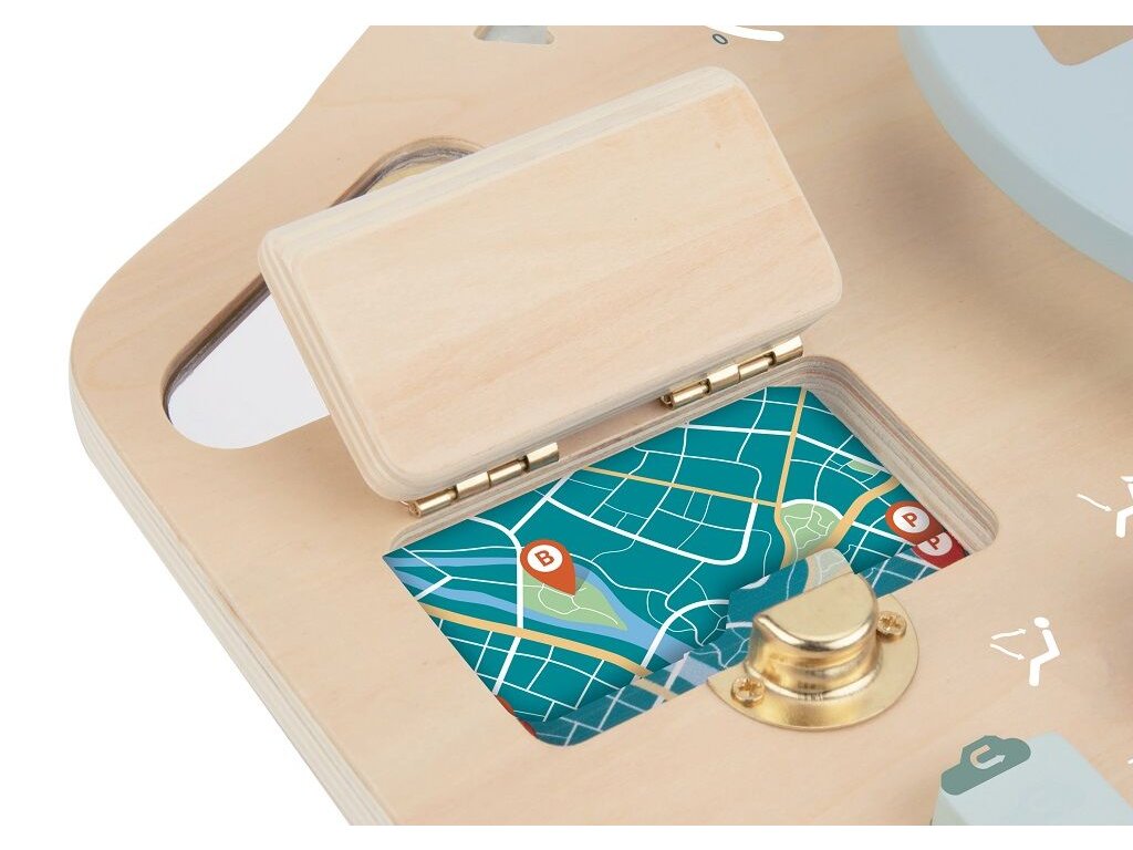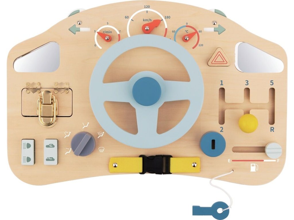 Hrací deska ve tvaru auta s volantem nabízí dětem interaktivní hru plnou objevování. Zámky, pásky, tlačítka i otočné prvky umožňují procvičovat posouvání, otáčení a otevírání, což přirozeně připravuje dítě na běžné denní činnosti. Volant posouvá hru na novou úroveň a podporuje představivou a kreativní hru, která děti zabaví na dlouhou dobu.