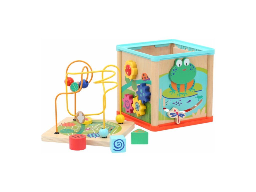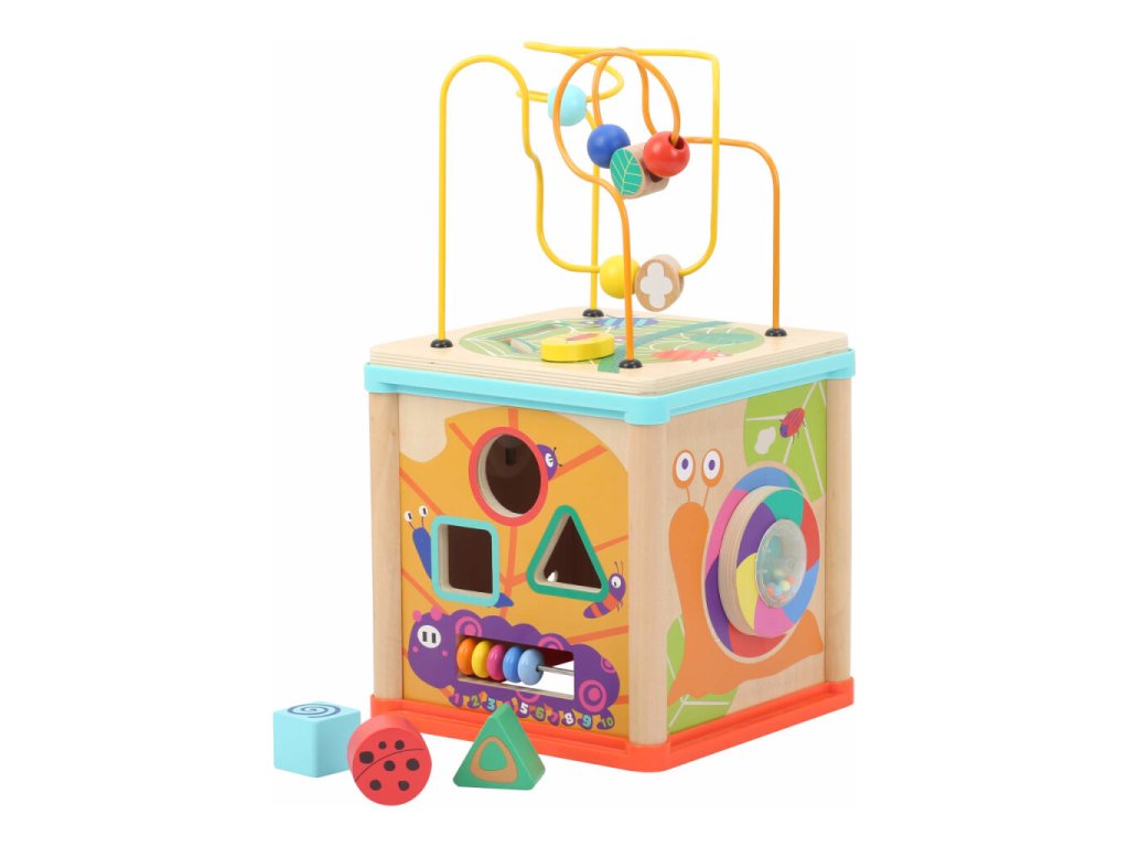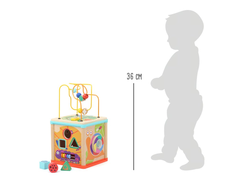 Dřevěná motorická kostka Garden nabízí na svých stěnách pestrou škálu herních aktivit. Děti mohou objevovat korálkové bludiště na víku, vkládačku, ozubená kolečka, chrastítko a další interaktivní prvky, které přirozeně rozvíjejí jemnou motoriku, orientaci v prostoru i koordinaci ruka–oko. Kostka je zdobena pestrobarevnými motivy zvířátek a přírody, které podporují dětskou fantazii a rozpoznávání tvarů a barev. Vyrobena je ze silné překližky a odolných materiálů, což zajišťuje dlouhou životnost. Díky otočnému víku je kostka prakticky skladná a snadno se ukládá do police.