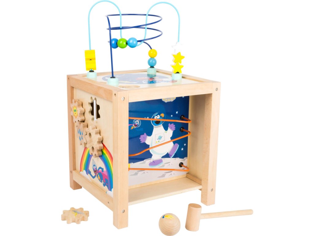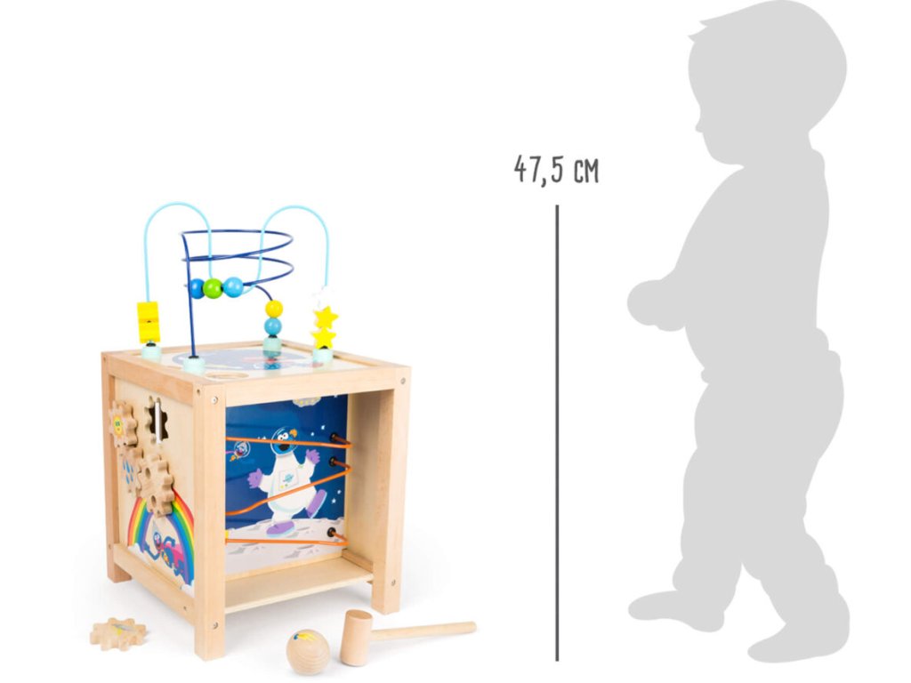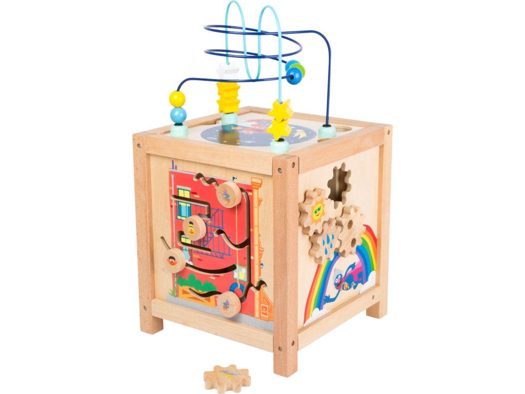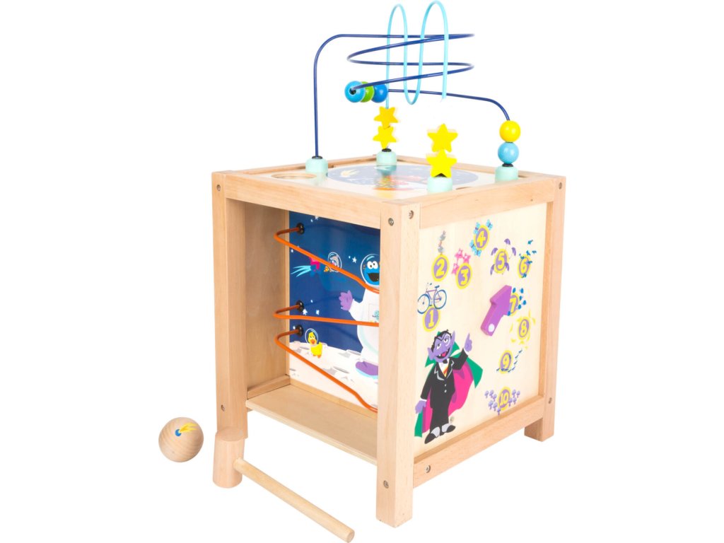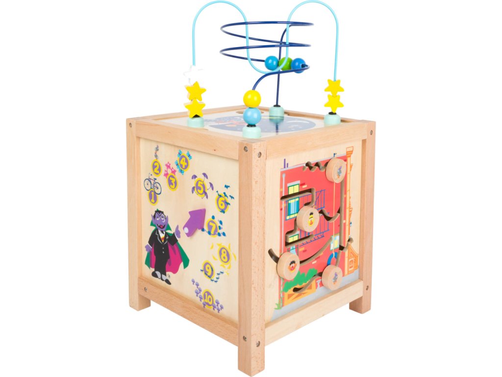 Tato rozmanitá motorická kostka je vyrobena ze stabilního 100% FSC certifikovaného dřeva a zdobena oblíbenými postavami z pohádky Sezame, otevři se! Každá strana kostky nabízí jiný typ motorické a smyslové aktivity. Korálková dráha s motivem noční oblohy pomáhá dětem se zklidněním, ozubená kola hravou formou vysvětlují vznik duhy a vložení ozubeného kolečka vytváří zvuk hromu. Jezdící kolečka seznamují děti s denní rutinou a zatloukací hra posílá dřevěné míčky přímo bránou Sezamu. Hrabě Drákula pak děti učí základní počty. Díky pestré kombinaci her kostka zapojuje všechny smysly a dokáže děti zabavit na dlouhé hodiny.