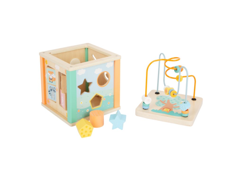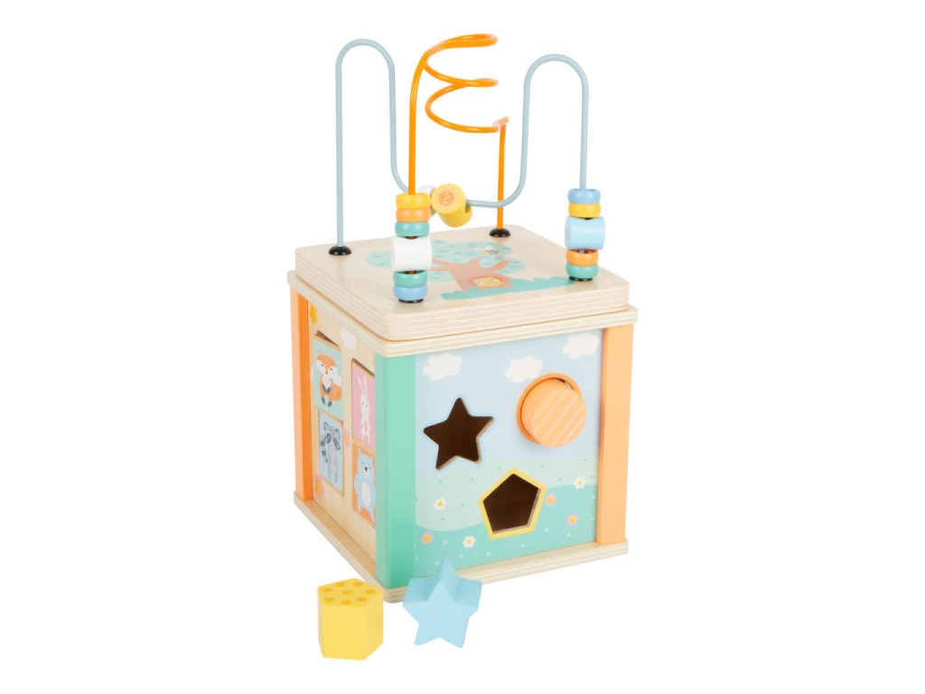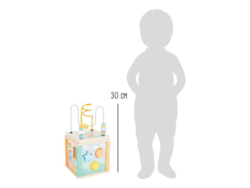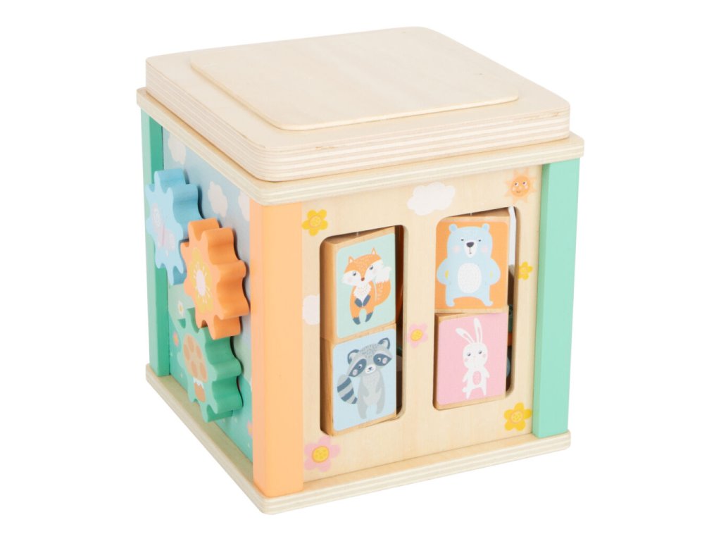 Dřevěná motorická kostka v pastelových barvách je navržena tak, aby zaujala i ty nejmenší děti. Nabízí pestrou škálu aktivit – perličkové bludiště, otáčející se obrázky, vkládací otvory s kostkami i ozubená kolečka. Každý prvek přirozeně rozvíjí jemnou motoriku, koordinaci ruka–oko a učí děti rozeznávat barvy a tvary. Kostka je laděna do jemných pastelových odstínů s roztomilými zvířecími motivy, díky čemuž se stává nejen hračkou, ale i krásným doplňkem dětského pokoje. Horní víko lze sundat a uložit dovnitř kostky vzhůru nohama, což šetří místo při ukládání.