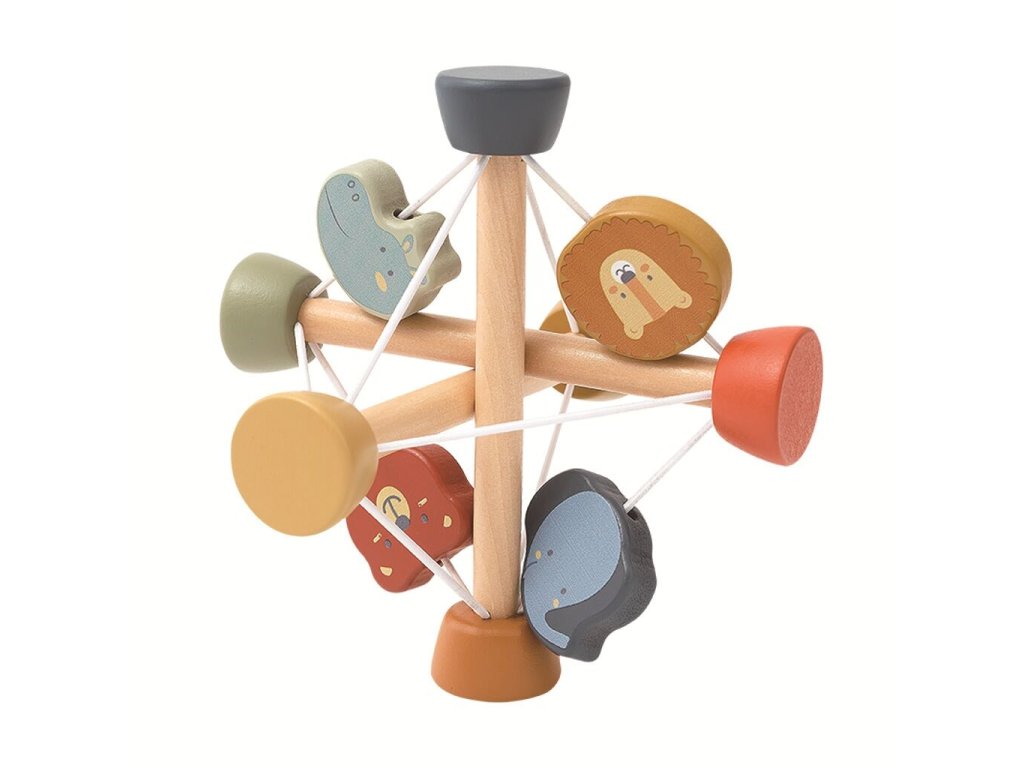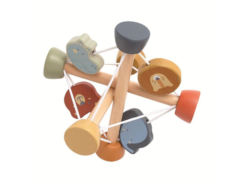 Aktivní koule Safari je inovativní dřevěná hračka navržená speciálně pro malé děti již od 10 měsíců. Pevná dřevěná konstrukce je doplněna pružnými gumičkami a roztomilými zvířátky v safari motivu – levem, slonem, hrochem a medvědem. Děti mohou zvířátka otáčet, posouvat, tahat za ně a stlačovat dřevěné kolíky, čímž objevují vztah mezi pohybem a reakcí. Hračka přirozeně rozvíjí jemnou motoriku, koordinaci ruka-oko a smyslové vnímání. Pastelové barvy a jednoduchý tvar zaujmou dětskou pozornost a podporují rozpoznávání barev a tvarů.