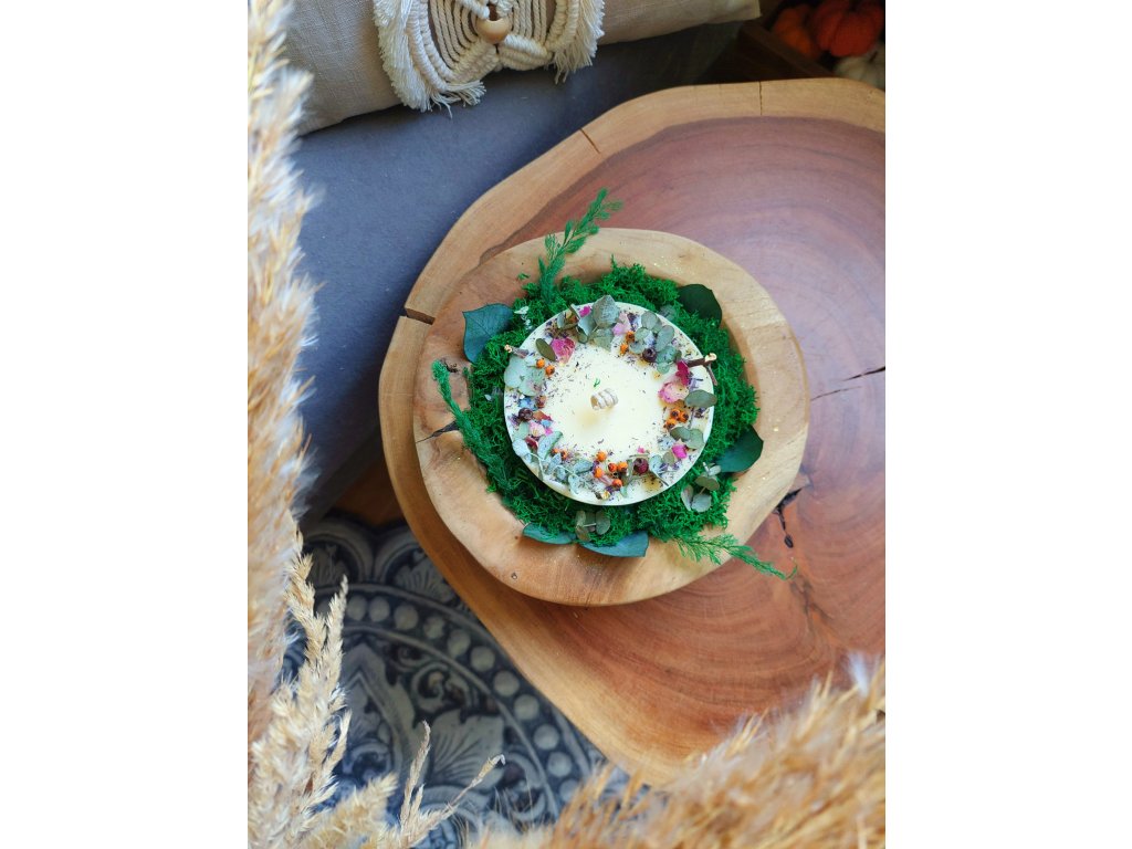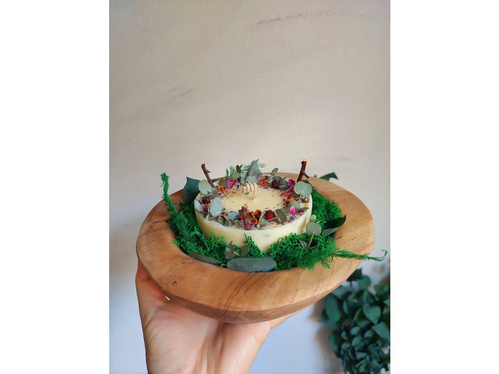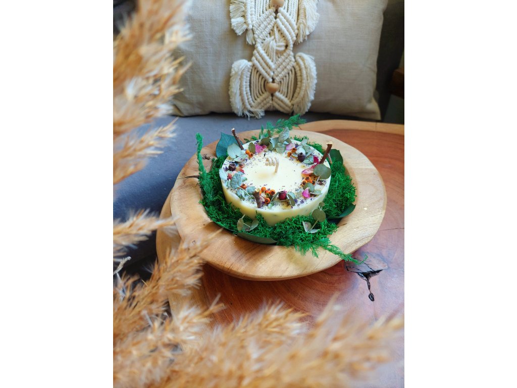 Součástí je ručně vyrobená svíčka ze sójového vosku s příměsí vosku včelího, díky čemuž je pevnější a má přírodní jemně žlutý odstín. Svíčka má průměr 9–10 cm, výšku cca 4 cm a je osazena ekobavlněným knotem. Voní přirozeně po včelím vosku, bez přidané parfemace.