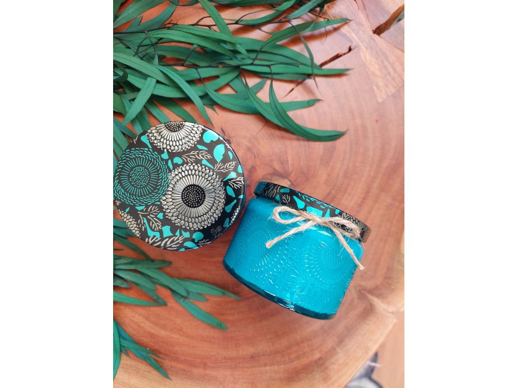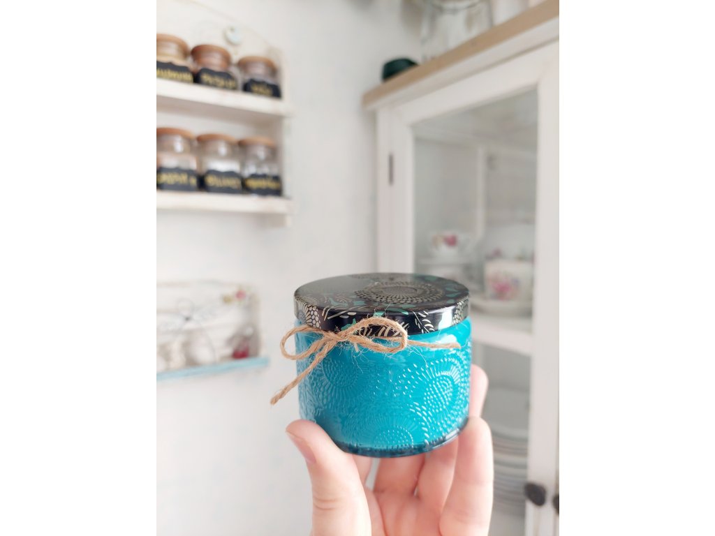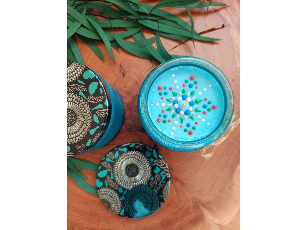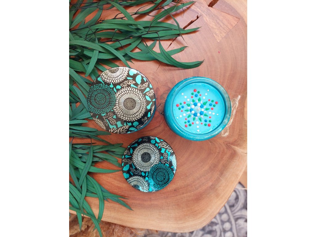 Svíčka je vložena do jedinečné modré sklenice s mandalovými motivy na skle i víčku. Tyrkysově dobarvený sójový vosk doplňuje ručně malovaná mandala, vytvořená tečkovací technikou voskovými pery. Každý kus je jedinečný.