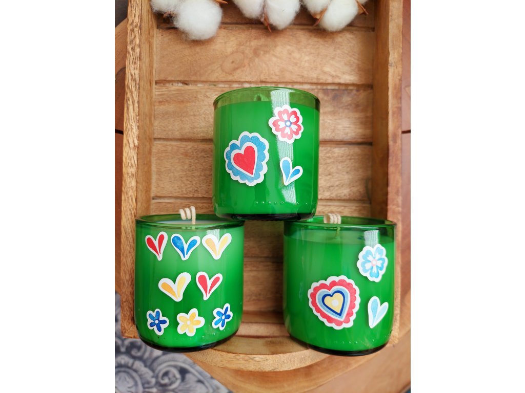 Přírodní svíčka MORAVSKÉ KOUZLO spojuje atmosféru Jižní Moravy s vůní, která připomíná sladké či ovocné víno. Je odlita do zelené sklenice vzniklé upcyklací vinné lahve – sklenice je kvalitně zabroušená, bezpečná, na výšku měří cca 8 cm a má průměr přibližně 6,5 cm. Po vypálení ji můžete používat dál, například jako skleničku na pití.