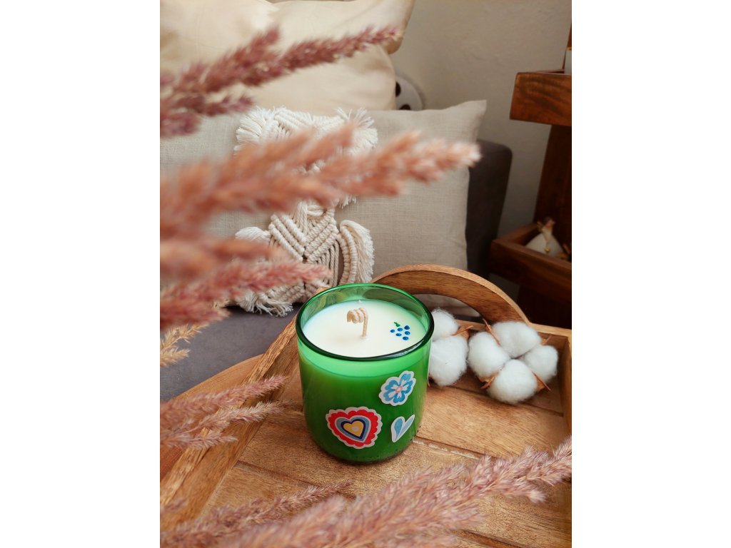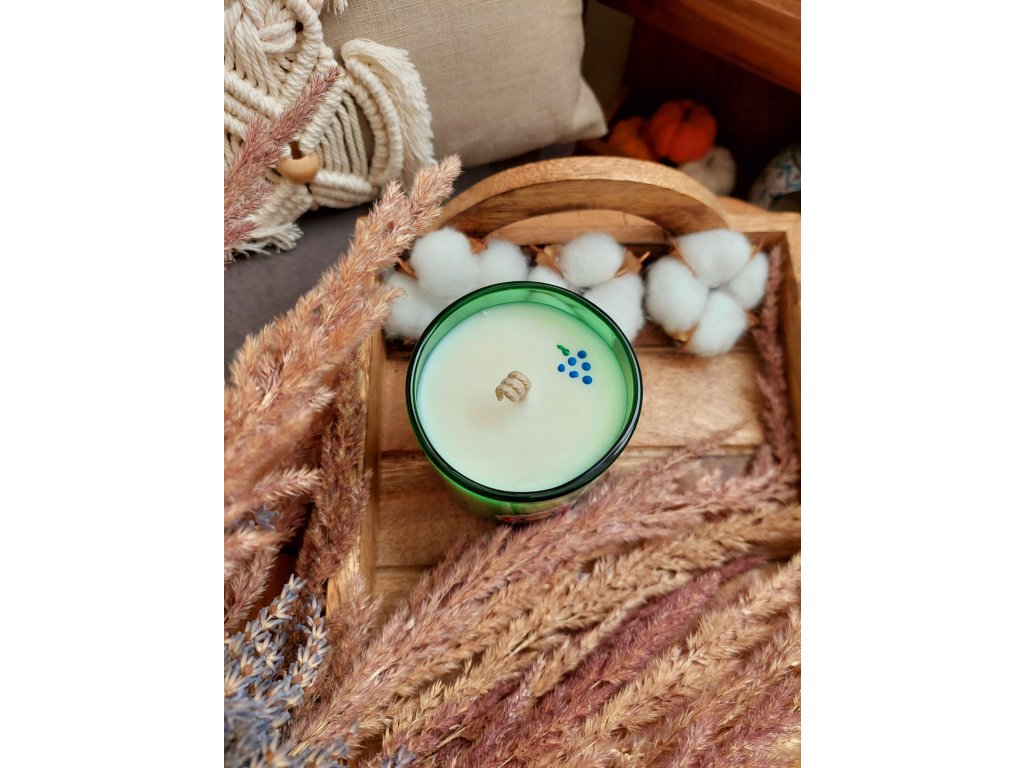 Svíčka je tvořena ze sójového vosku s ekobavlněným knotem a na povrchu ji doplňuje vosková malůvka hroznu, která podtrhuje moravskou tématiku. Na každé skleničce najdete také folklórní samolepky s moravskými motivy. Vůně je sladká, ovocná a velmi originální – vhodná i pro muže.