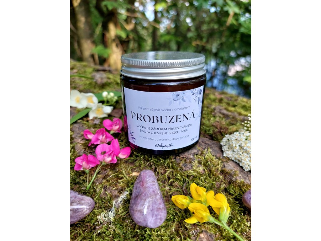Přírodní svíčka se záměrem PROBUZENÁ je ručně vyráběná ze sójového vosku a ekologického bavlněného knotu. Obsahuje ametyst, minerál spojený s intuicí, klidem a otevřenou myslí. Energetická kombinace mandarinky, citronelly a litsey cubeby vytváří výrazně svěží, citrusově bylinnou vůni, která podporuje bdělost, lehkost a vědomé naladění. Svíčka je dodávána v tmavé sklenici se zlatým nebo černým víčkem.