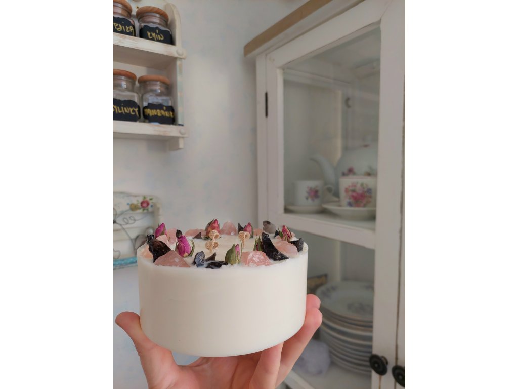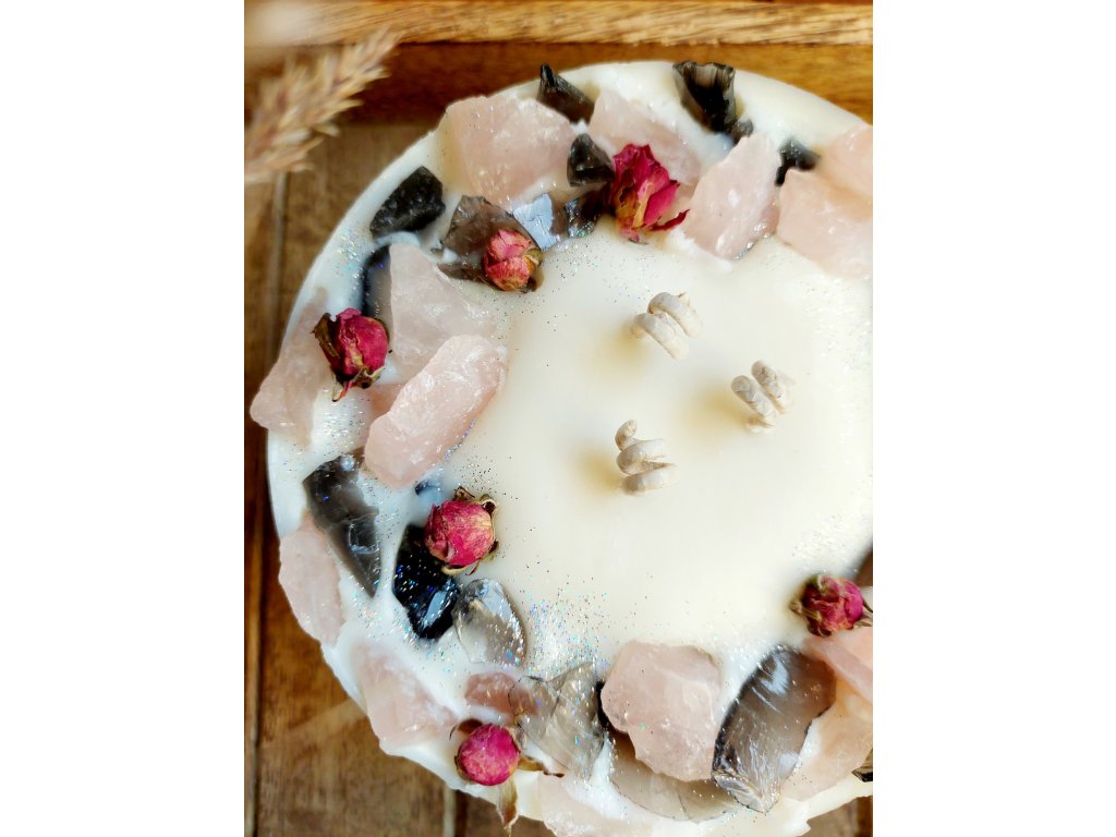 Svíčka SNĚHURKA je originální ruční tvořená svíčka s luxusním bílým lesklým vzhledem a energetickým zdobením. Kombinace růženínu a dračího skla (obsidiánu) předává silné vlastnosti obou minerálů – harmonii, lásku, ochranu a vyrovnání emocí. Díky třem bavlněným knotům vytváří krásné světlo a můžete ji využít jako energetický posilovač záměrů nebo jako jedinečnou přírodní dekoraci.